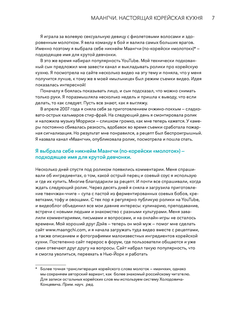 родилась и выросла в Южной Корее. С детства увлекалась приготовлением традиционных блюд. Автор видеоблога на YouTube (с более 5 млн подписчиков) и сайта www.maangchi.com, где выкладывает ролики с рецептами. Живет в Нью-Йорке. Маангчи называют корейской Джулией Чайлд. |
