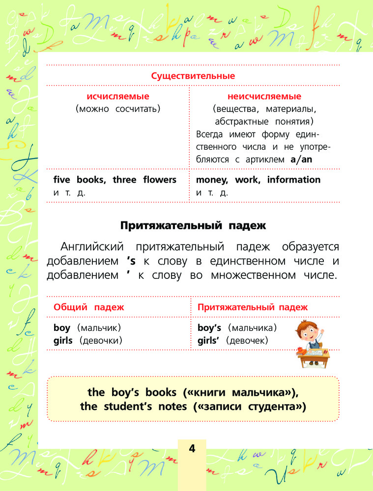 Незаменимый помощник в изучении английского языка! В этой книге представлены основные правила английской грамматики и фонетики. Все правила даны схематично и кратко, что позволяет лучше усваивать материал. В пособии в наглядной форме изложены основные правила чтения английских букв и буквосочетаний, сопровождаемые заданиями и яркими иллюстрациями. В процессе обучения школьники не только научатся правильно читать английские слова, но и познакомятся со знаками современной международной фонетической транскрипции, а также освоят тонкости грамматики. Издание адресовано учащимся начальной школы. Подходит для дополнительного образования в школе и дома.