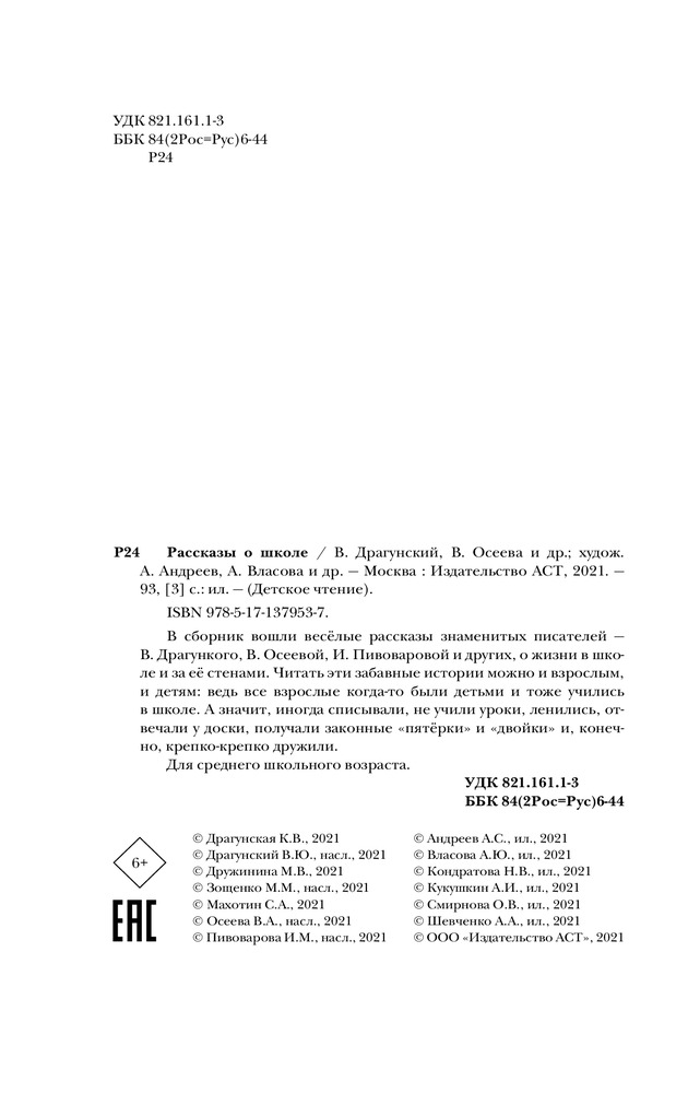 В данный момент этот товар отсутствует в продаже. Возможно, у нас найдется аналогичный или похожий товар здесь. Серия: Детское чтение В сборник вошли весёлые рассказы знаменитых писателей — В. Драгункого, В. Осеевой, И. Пивоваровой и других — о жизни в школе и за ее стенами. Читать эти забавные истории можно и взрослым, и детям — ведь все взрослые когда-то были детьми и тоже учились в школе. А значит, иногда списывали, не учили уроки, ленились, отвечали у доски, получали законные «пятерки» и «двойки» и, конечно, крепко-крепко дружили. |