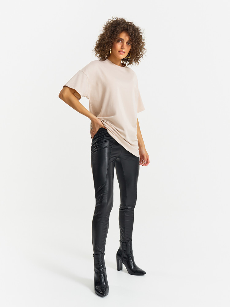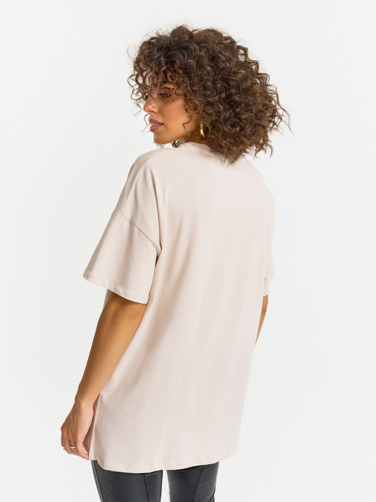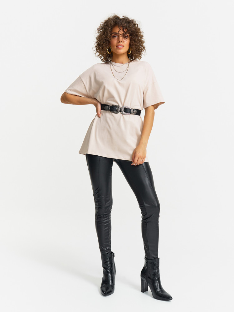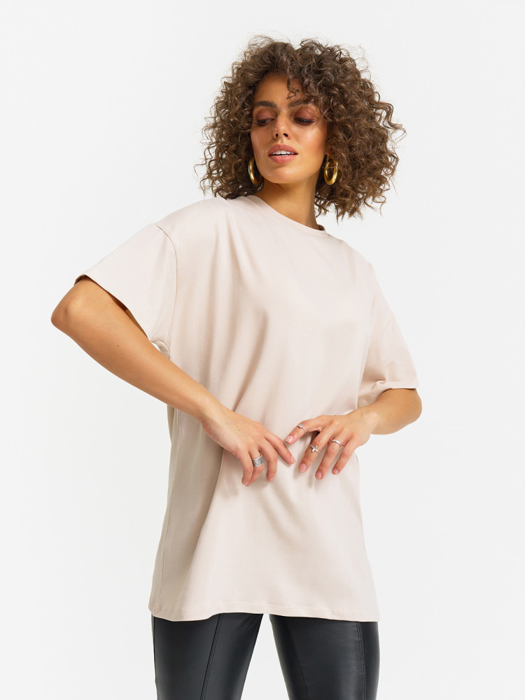 Очень классная футболка, материал просто супер. Но она сначала немного красилась (после двух стирок это прошло). И она оооочень оверсайз. Для модниц)