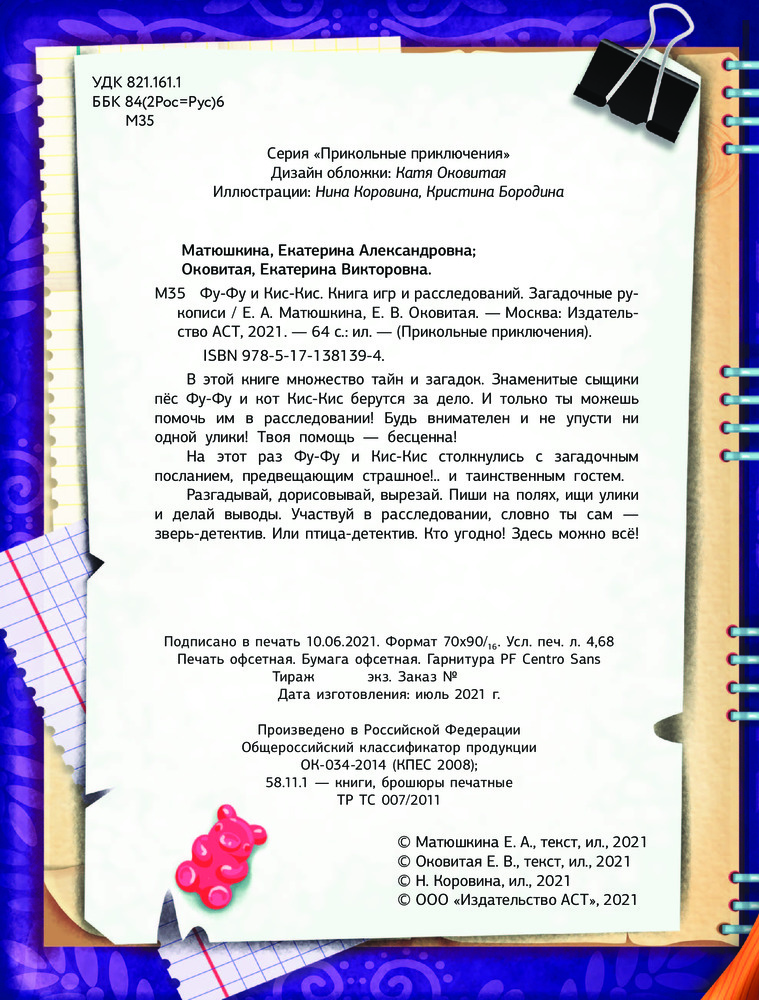 Фу-Фу и Кис-Кис. Книга игр и расследований. Загадочные рукописиЕкатерина Александровна Матюшкина, Екатерина Викторовна Оковитая В данный момент этот товар отсутствует в продаже. Возможно, у нас найдется аналогичный или похожий товар здесь. Серия: Прикольные приключения В этой книге множество тайн и загадок. Знаменитые сыщики пёс Фу-Фу и кот Кис-Кис берутся за дело. И только ты можешь помочь им в расследовании! Будь внимателен и не упусти ни одной улики! Твоя помощь — бесценна! На этот раз Фу-Фу и Кис-Кис столкнулись с загадочным посланием, предвещающим страшное!.. и таинственным гостем. Разгадывай, дорисовывай, вырезай. Пиши на полях, ищи улики и делай выводы. Участвуй в расследовании, словно ты сам — зверь-детектив. Или птица-детектив. Кто угодно! Здесь можно всё! |