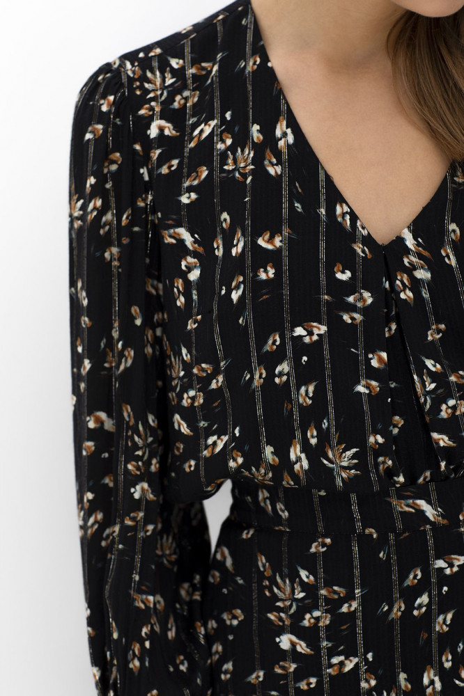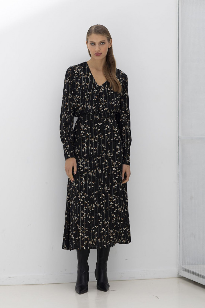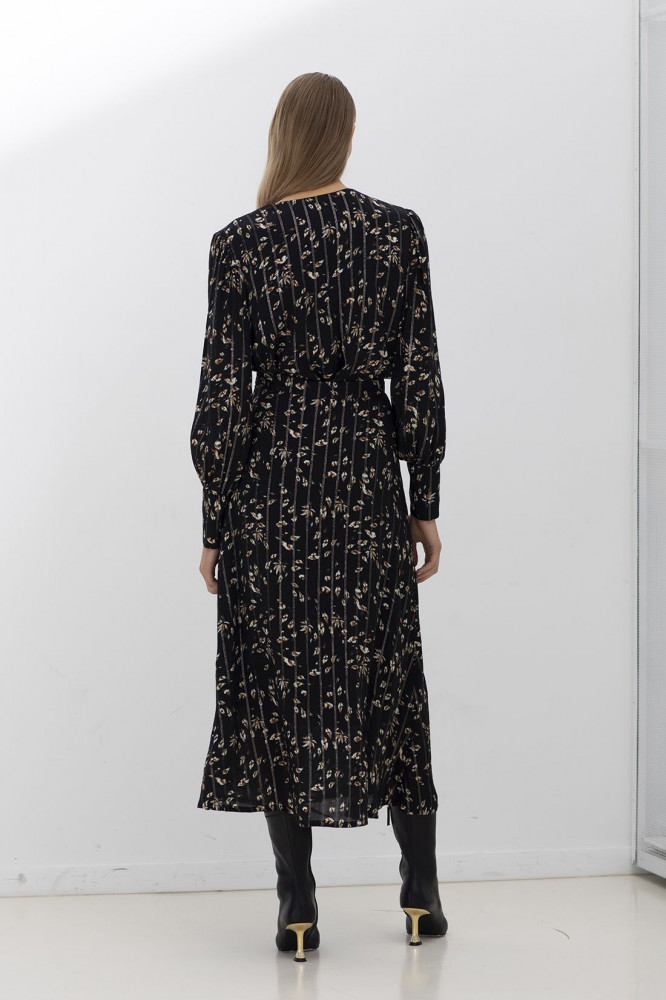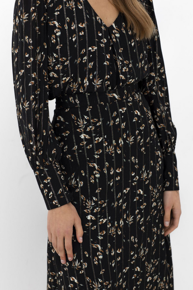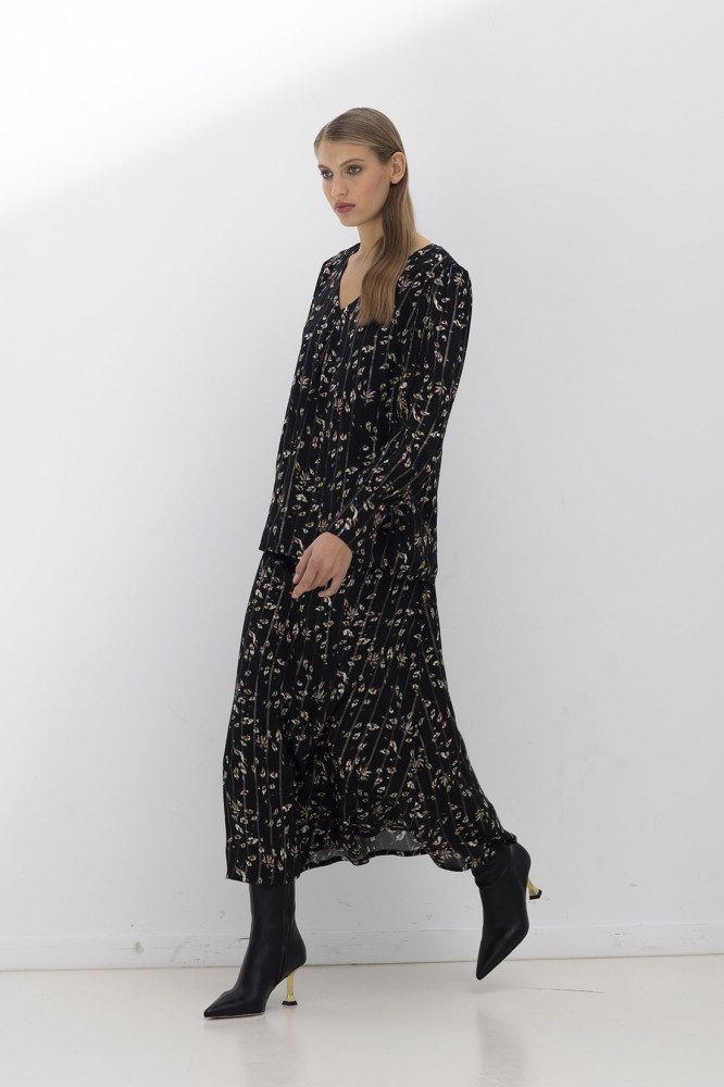 Женская юбка длины макси. Особенностью модели является флористический принт с добавлением нитей люрекса. Высокая посадка и пояс, акцентирующий талию выгодно подчеркивают достоинства фигуры. Модель с длиной макси универсальная и комфортная для любого случая, крой визуально вытягивает силуэт, придает изящность и утонченность фигуре.