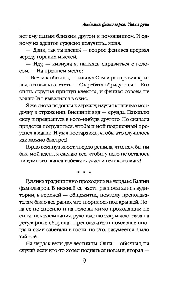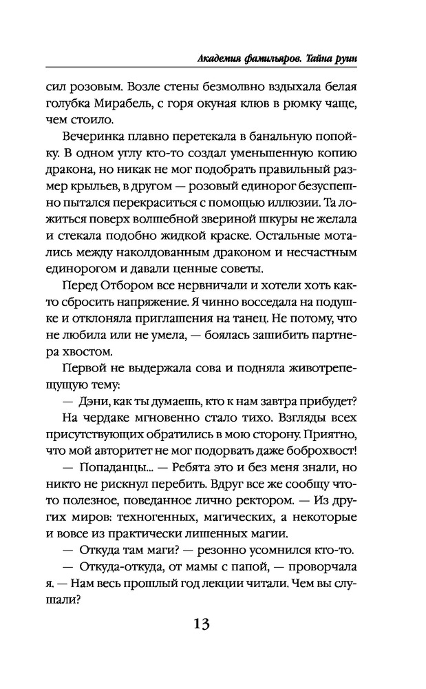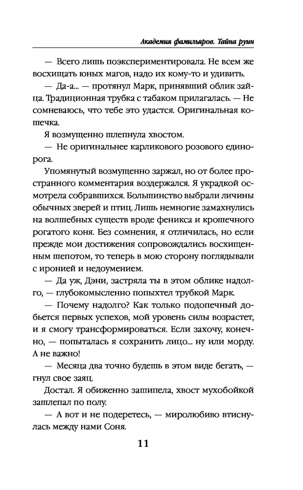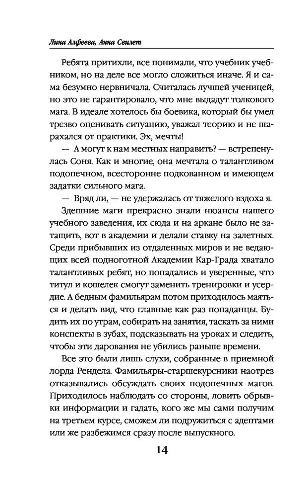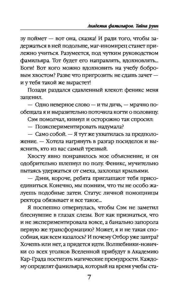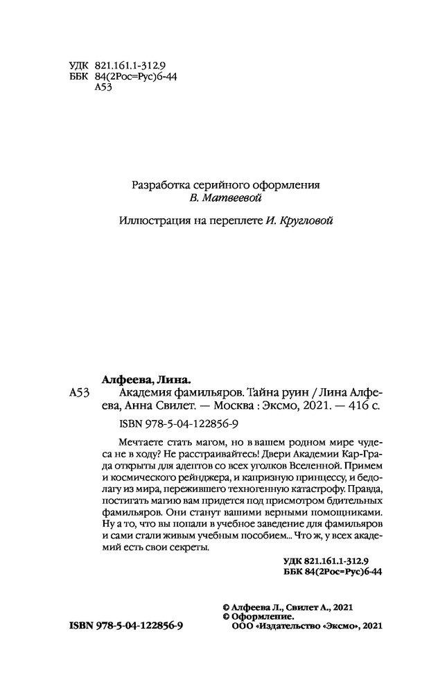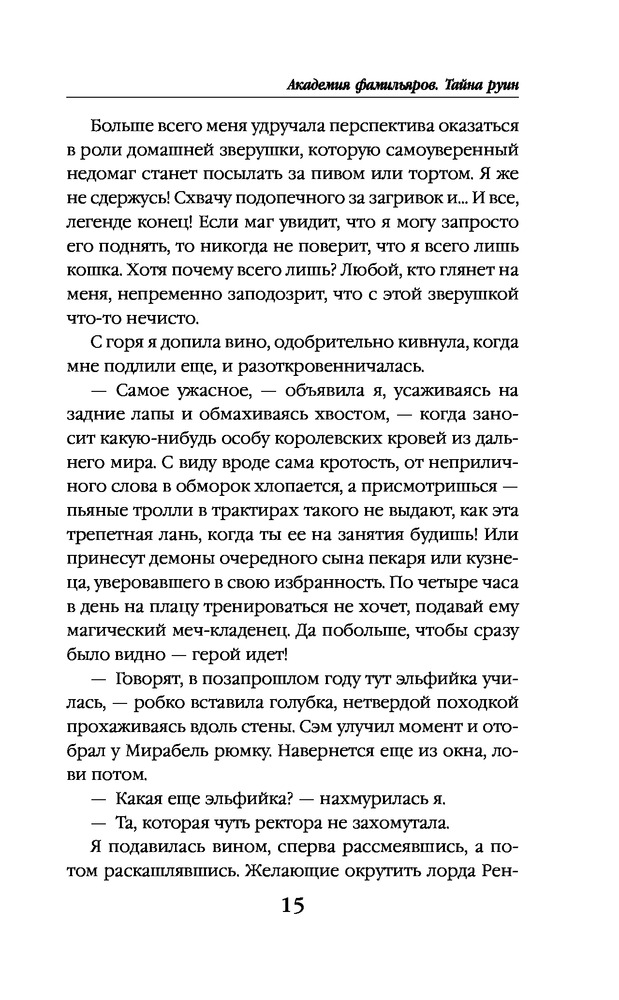 Академия фамильяров. Тайна руинВ данный момент этот товар отсутствует в продаже. Возможно, у нас найдется аналогичный или похожий товар здесь. Серия: Академия Магии. Большой покет Мечтаете стать магом, но в вашем родном мире чудеса не в ходу? Не расстраивайтесь! Двери Академии Кар-Града открыты для адептов со всех уголков Вселенной. Примем и космического рейнджера, и капризную принцессу, и бедолагу из мира, пережившего техногенную катастрофу. Правда, постигать магию вам придется под присмотром бдительных фамильяров. Они станут вашими верными помощниками. Ну а то, что вы попали в учебное заведение для фамильяров и сами стали живым учебным пособием... Что ж, у всех академий есть свои секреты. |
