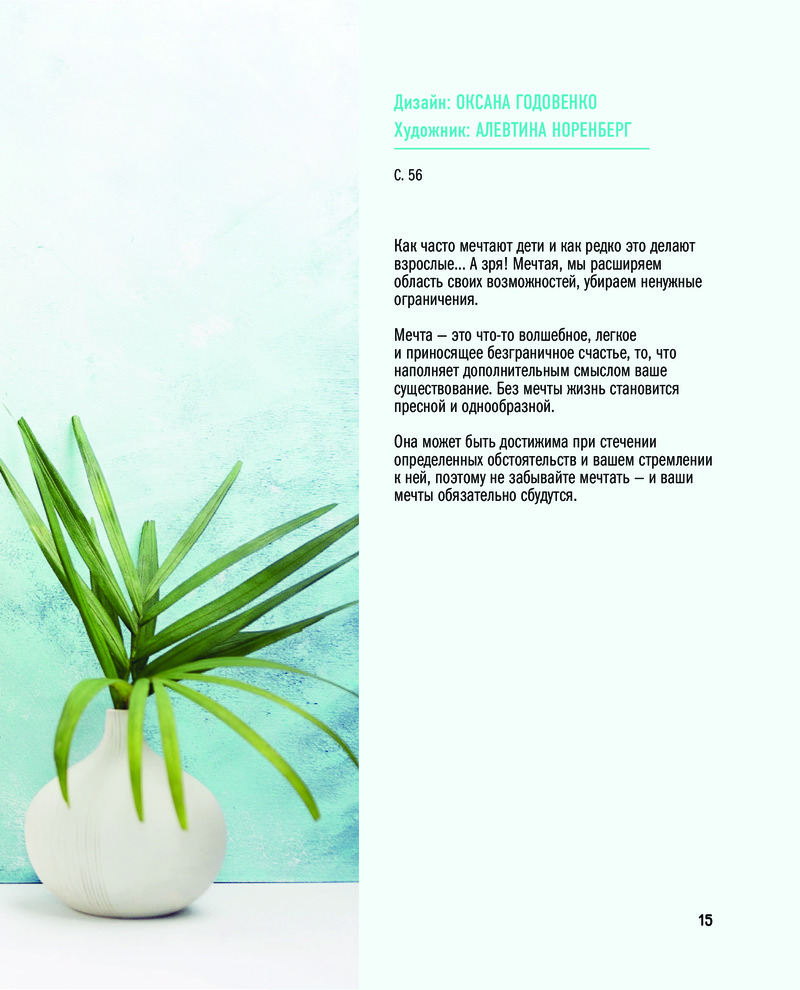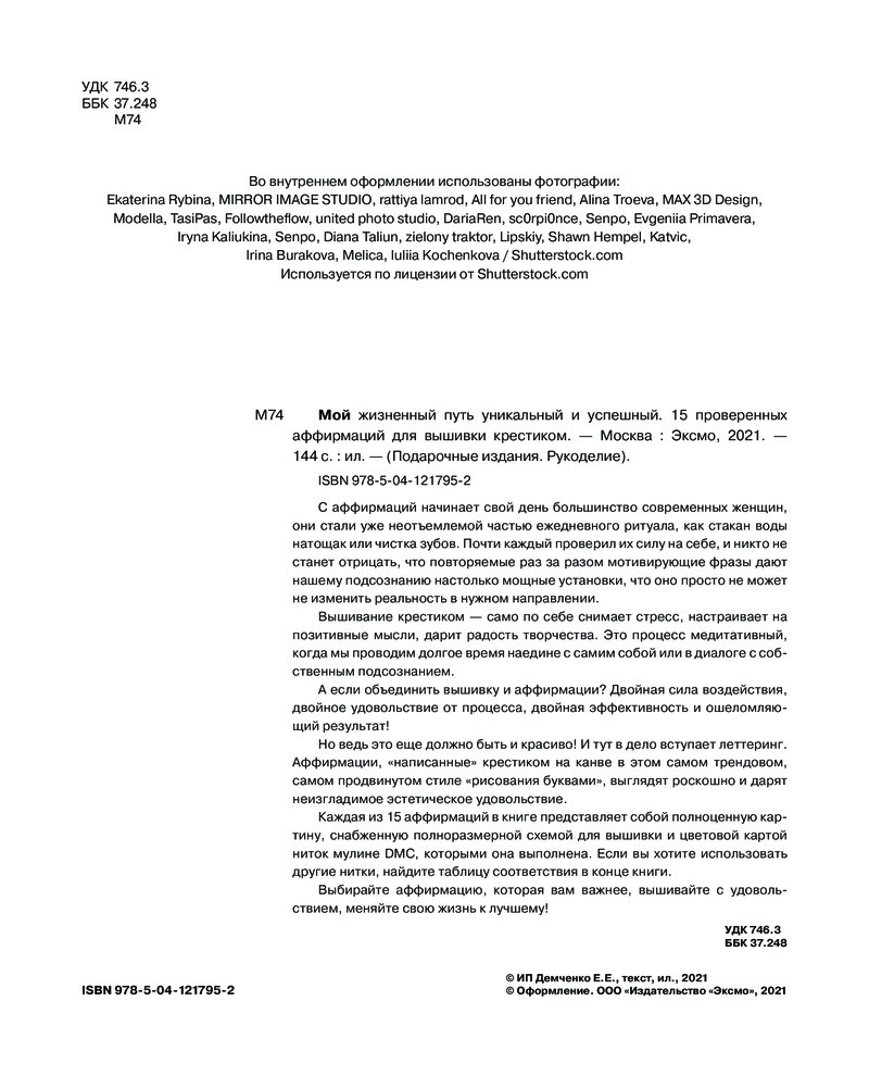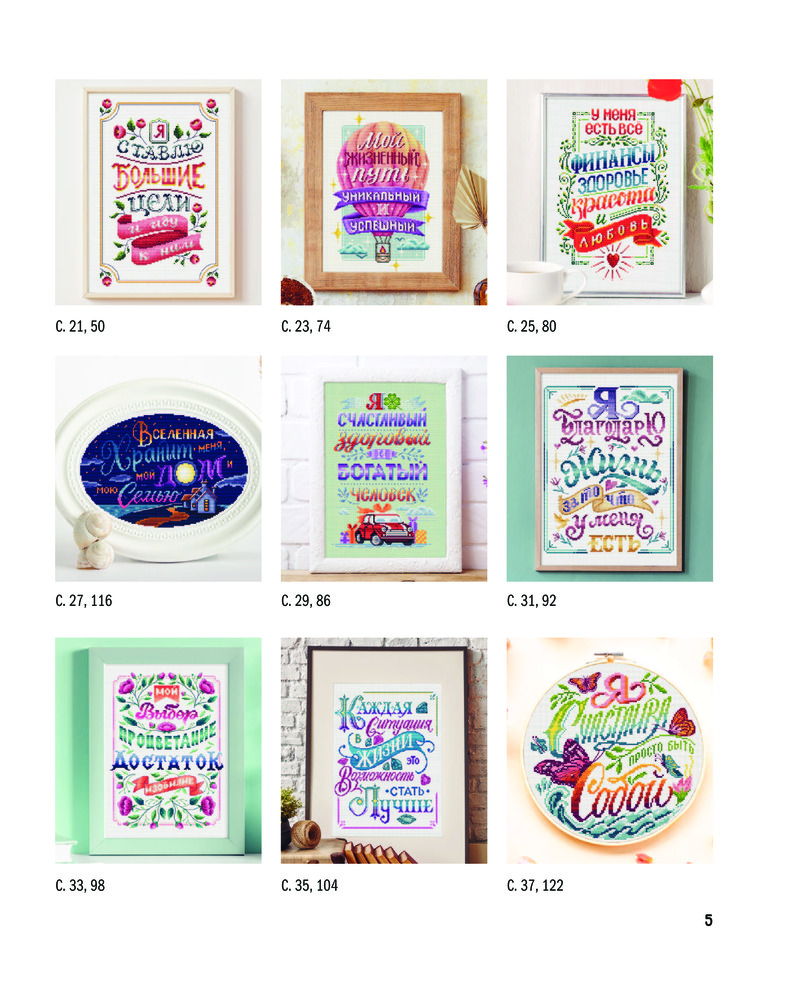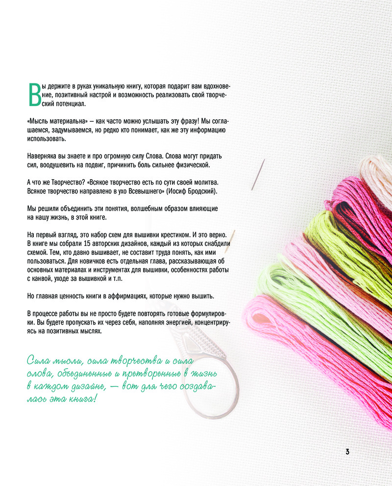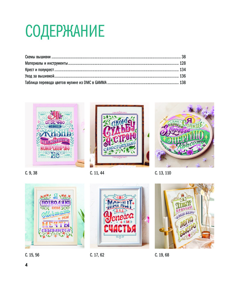 Каждая из 15 аффирмаций в книге представляет собой полноценную картину, снабженную полноразмерной схемой для вышивки и цветовой картой ниток мулине DMC, которыми она выполнена. Если вы хотите использовать другие нитки, найдите таблицу соответствия в конце книги.