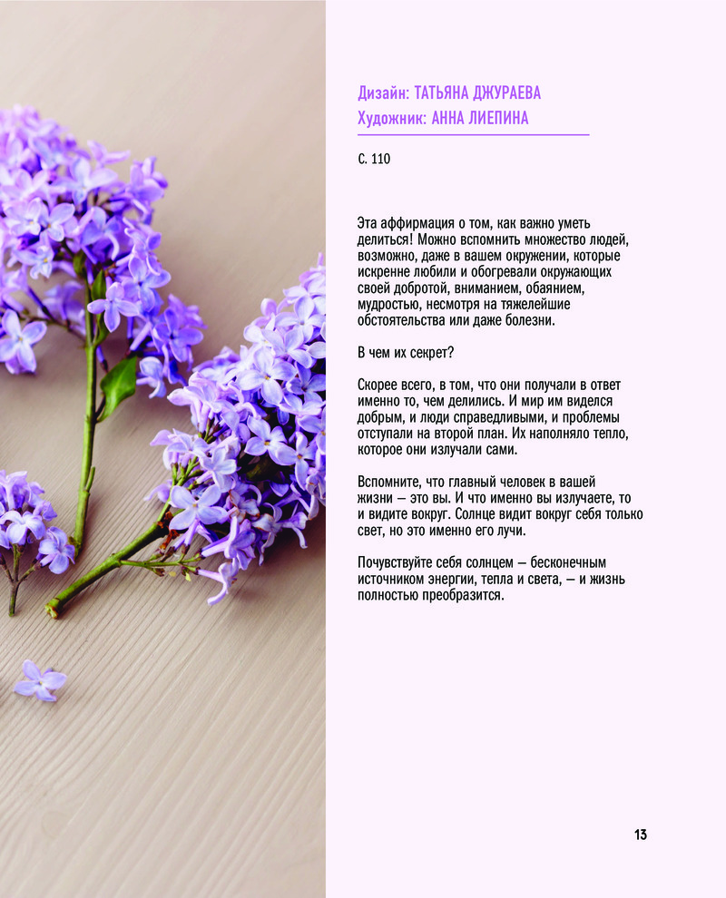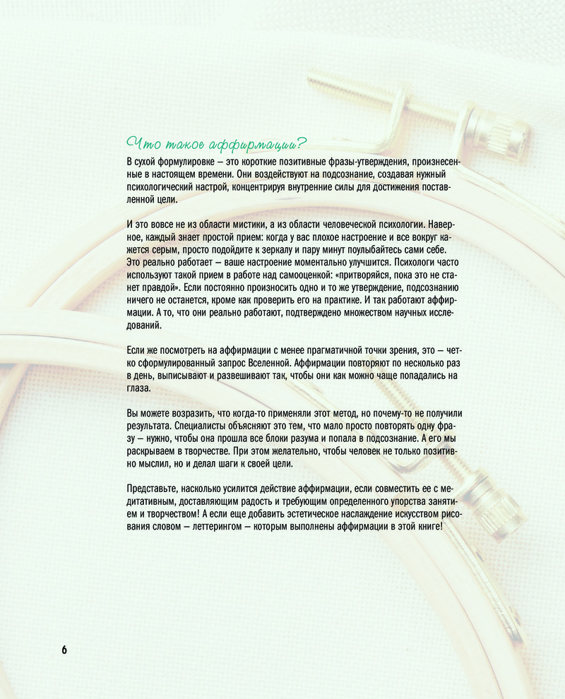 Серия: Подарочные издания. Рукоделие С аффирмаций начинает свой день большинство современных женщин, они стали уже неотъемлемой частью ежедневного ритуала, как стакан воды натощак или чистка зубов. Почти каждый проверил их силу на себе, и никто не станет отрицать, что повторяемые раз за разом мотивирующие фразы дают нашему подсознанию настолько мощные установки, что оно просто не может не изменить реальность в нужном направлении.
