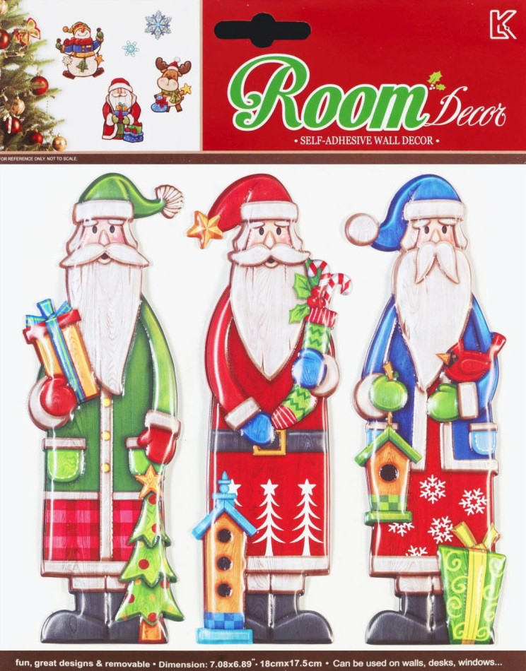 Набор состоит из 3 наклеек в виде Деда Мороза в разноцветных костюмах, размером 17 см. Рельефная поверхность выполнена с эффектом «под дерево». Данный тип наклеек очень хорошо крепится на стены, столы, зеркальные и стеклянные поверхности. Кроме оформления новогоднего интерьера, благодаря набору можно скрыть царапины, сколы на мебели и т.п. Наклейки быстро крепятся и легко снимаются, не оставляя следов. |