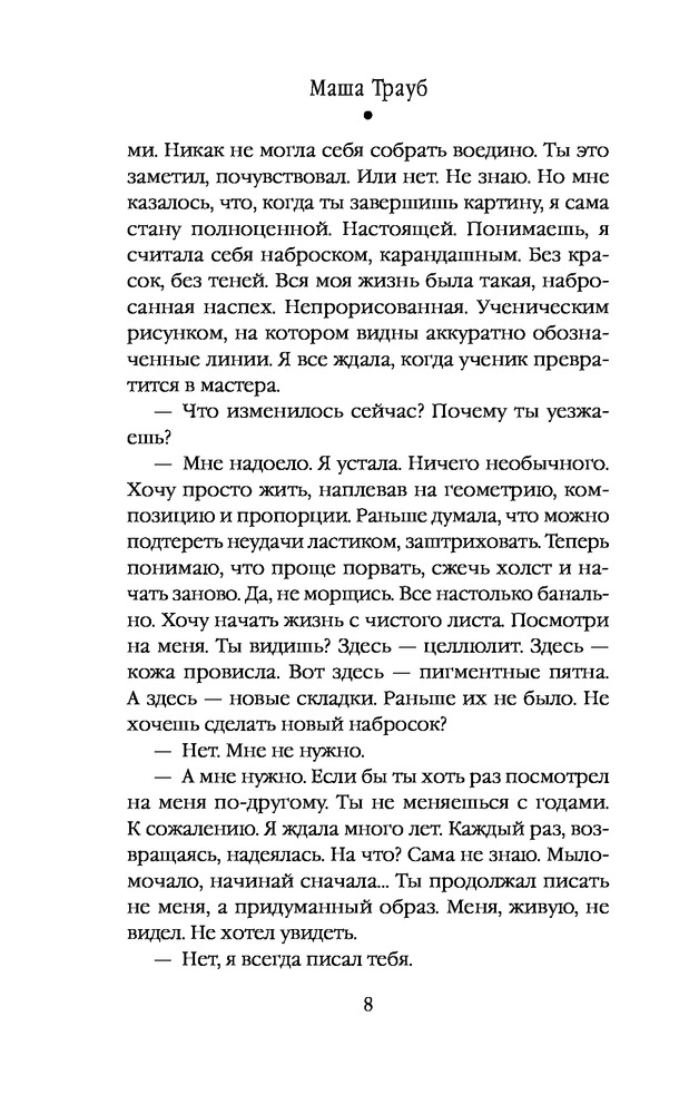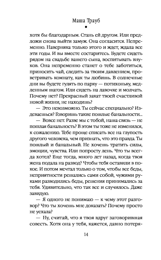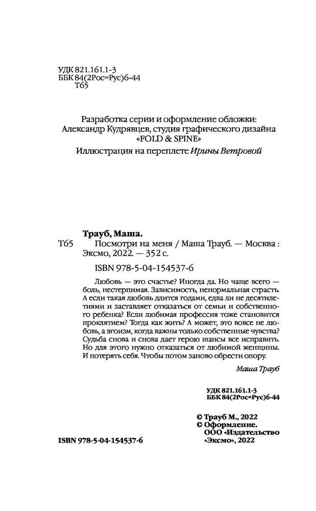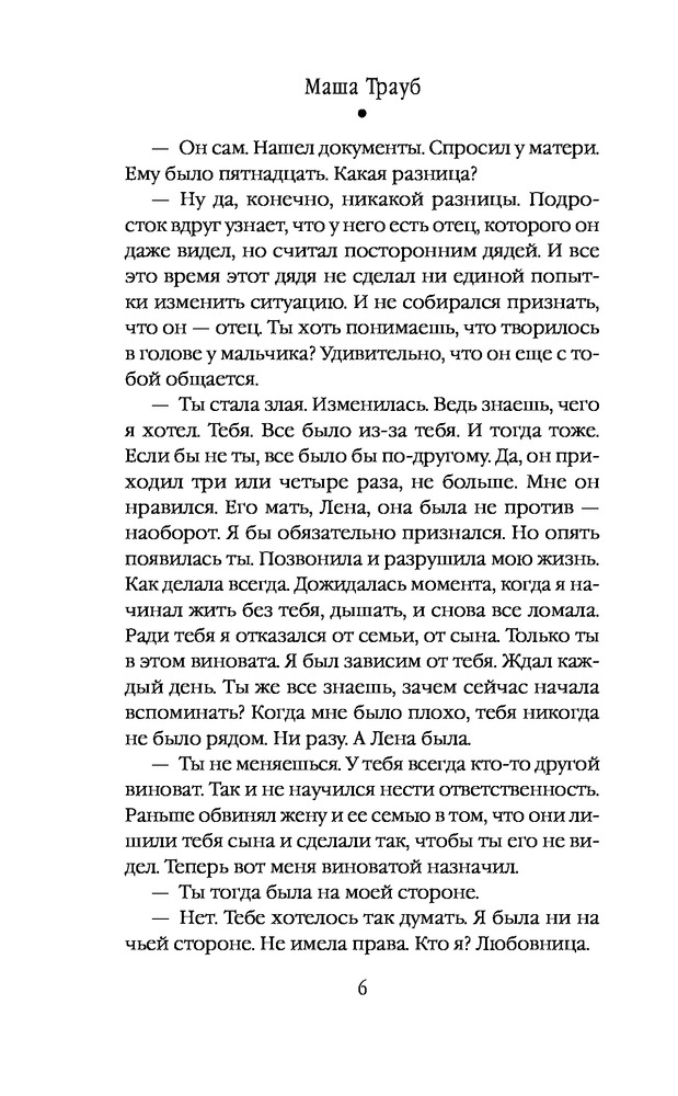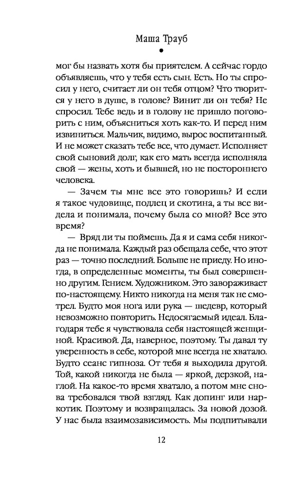 Серия: Проза Маши Трауб. Жизнь как в зеркале Любовь — это счастье? Иногда да. Но чаще всего — боль, нестерпимая. Зависимость, ненормальная страсть. А если такая любовь длится годами, едва ли не десятилетиями и заставляет отказаться от семьи и собственного ребенка? Если любимая профессия тоже становится проклятием? Тогда как жить? А может это вовсе не любовь, а эгоизм, когда важны только собственные чувства? Судьба снова и снова дает герою шансы все исправить. Но для этого нужно отказаться от любимой женщины. И потерять себя. Чтобы потом заново обрести опору. |