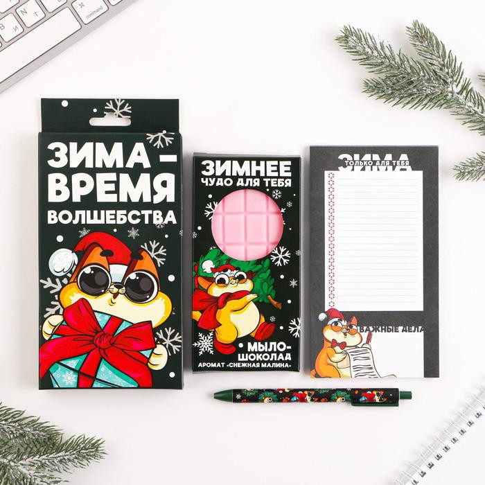 Хороший наборчик, на НГ как раз в тему, хорошо упакован, ручка пишет, запах от мыла насыщенный. Все понравилось.