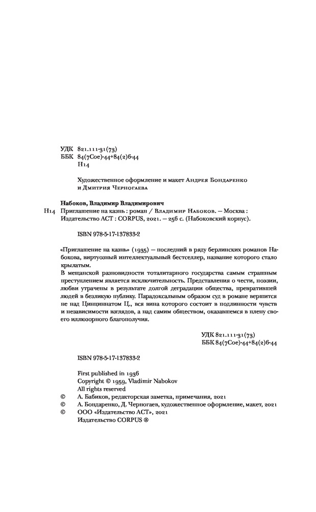 💳 Оплатить за товар можно при получении 🇰🇿 Есть бесплатная доставка по Казахстану 🎁 Копите бонусы с каждой покупки Серия: Набоковский корпус «Приглашение на казнь» (1935) — последний в ряду берлинских романов Набокова, виртуозный интеллектуальный бестселлер, название которого стало крылатым. |