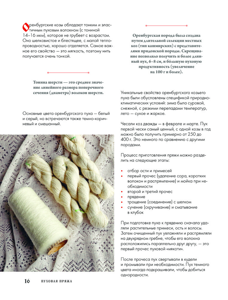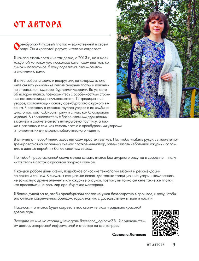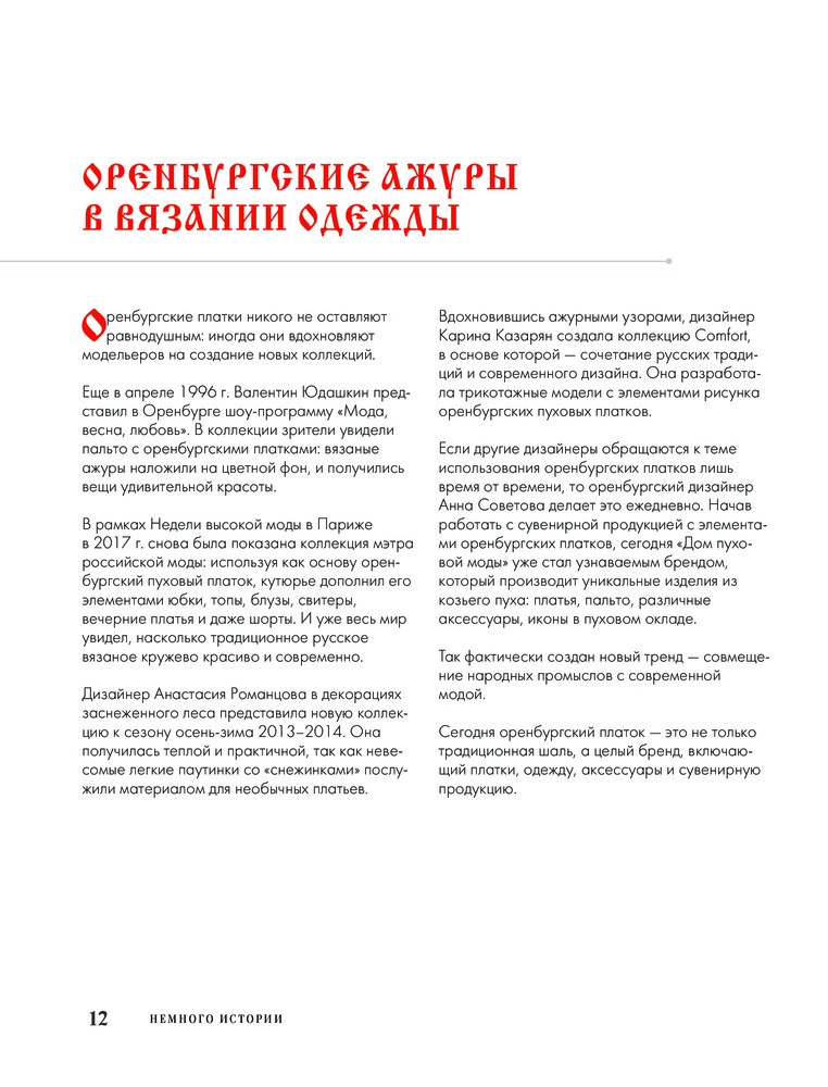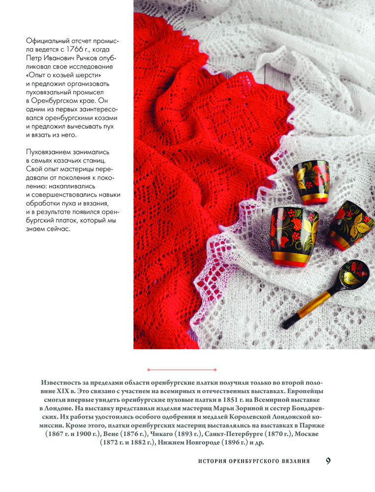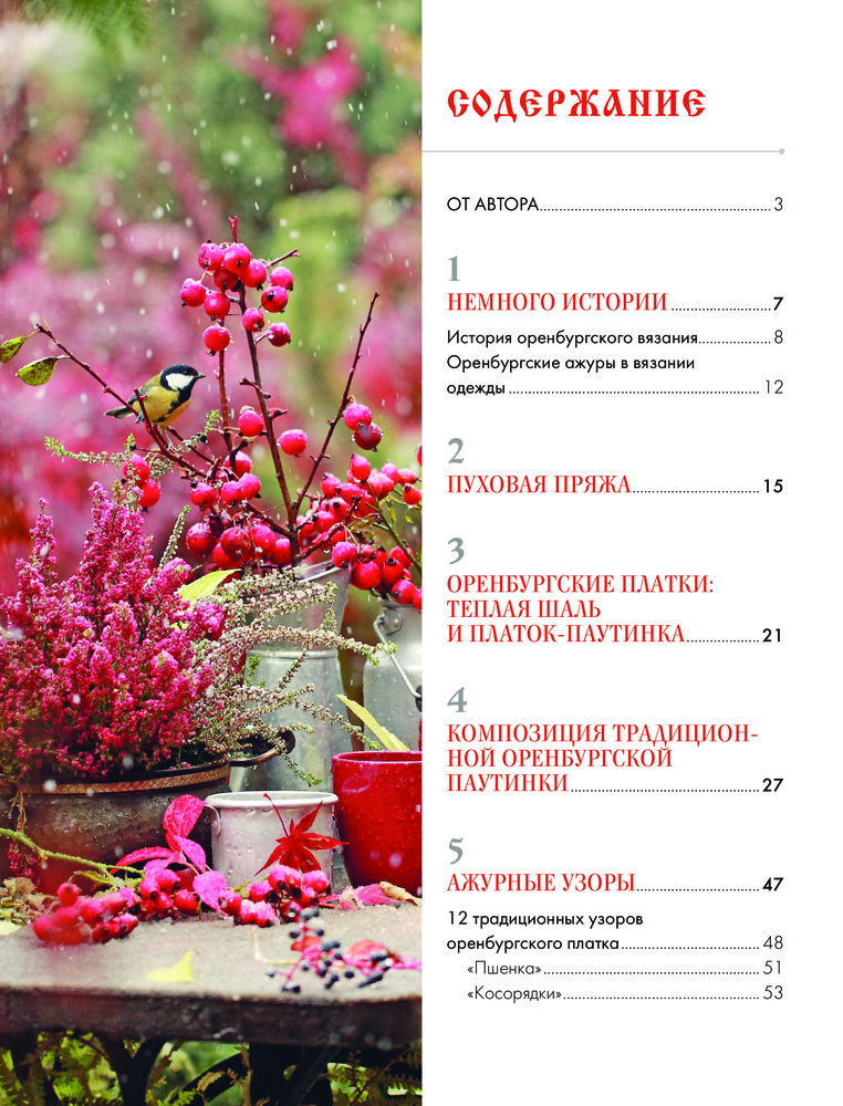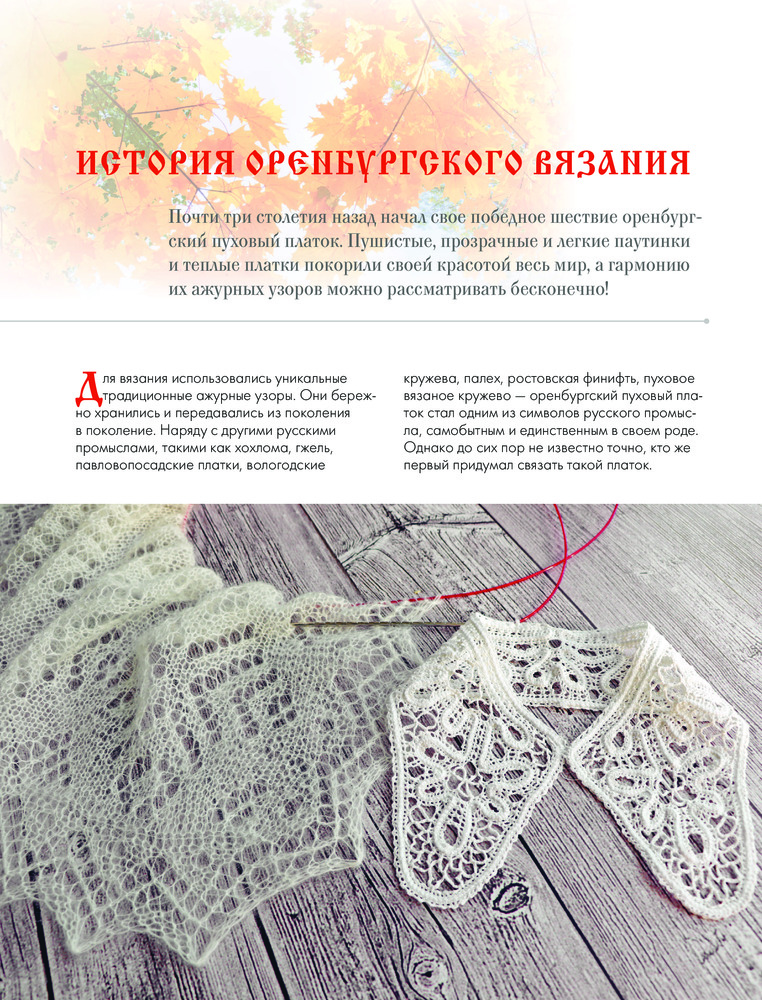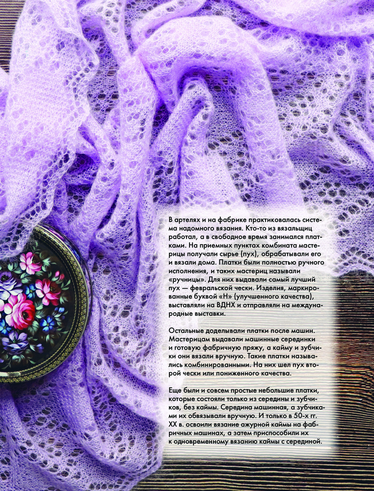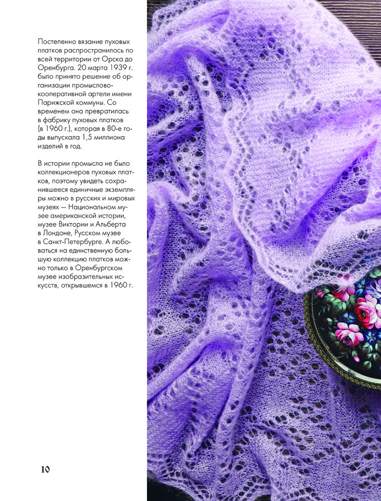 Автор более детально и углубленно рассматривает сложные мотивы, образованные из простых основных и группы ажурных узоров, со схемами и пояснениями, рассказывает об использовании 13-тикруговой композиции и раскрывает тему двухцветного вязания с примерами компоновки цветовых участков. Вы узнаете об истории оренбургских ажуров, об уникальной пряже, из которой они вяжутся, об особенностях оренбургских платков и их важных характеристиках, о разнице между платком и паутинкой, о композиции традиционной оренбургской паутинки.
