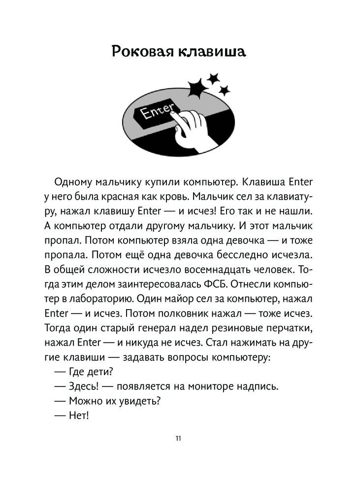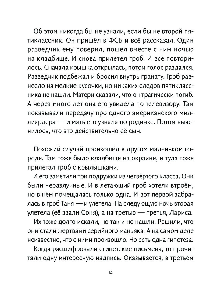 Серия: Сказки Волчка. Малая серия «Осторожно, крышка закрывается! Следующая остановка...» Какая ещё крышка? — спросите вы. Но, полистав книгу, поймёте — конечно же, гроба. Гроб с крылышками. Чёрный кефир. Роковой козёл. Массажист с фиолетовыми пальцами и учительница с белыми глазами. Привидения, оборотни, мертвецы. Таинственные превращения и загадочные исчезновения. Собирайтесь в кружок, убавляйте свет и медленно-медленно читайте самые страшные слова на свете своими самыми страшными голосами. Пока не станет жутко весело. |