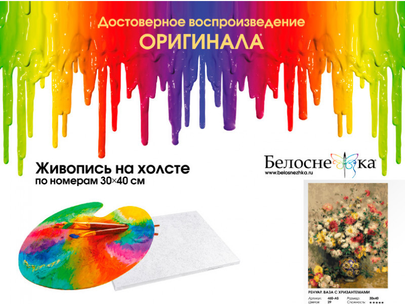 Внимание! Краски могут подсохнуть или быть слишком густыми — это не является браком, в этом случае добавьте небольшое количество воды и хорошо размешайте краску. Рекомендуем раскрашивать картину без длительных перерывов, чтобы краска в баночках не высыхала.