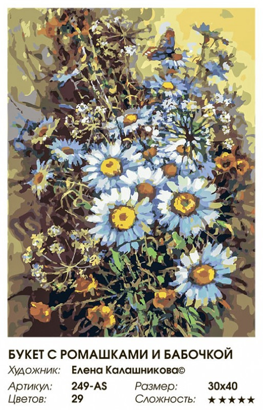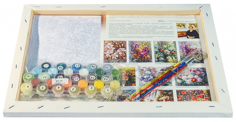 В этом наборе вы найдете холст на подрамнике, на который нанесены контуры рисунка, а также числа, указывающие на цвет, которым должна быть закрашена та или иная часть картины. Наносите краску нужного цвета на холст при помощи кисти, сверяясь с контрольной схемой. Это спокойное, неторопливое занятие подойдет и ребенку, и взрослому, к тому же оно помогает развить цветовосприятие, аккуратность и художественный вкус.