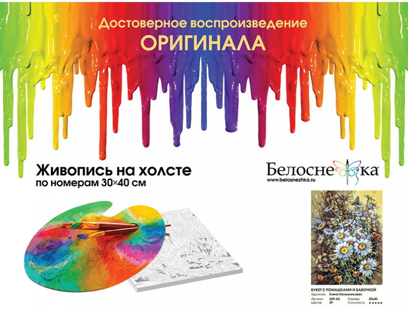 Внимание! Краски могут подсохнуть или быть слишком густыми — это не является браком, в этом случае добавьте небольшое количество воды и хорошо размешайте краску. Рекомендуем раскрашивать картину без длительных перерывов, чтобы краска в баночках не высыхала.