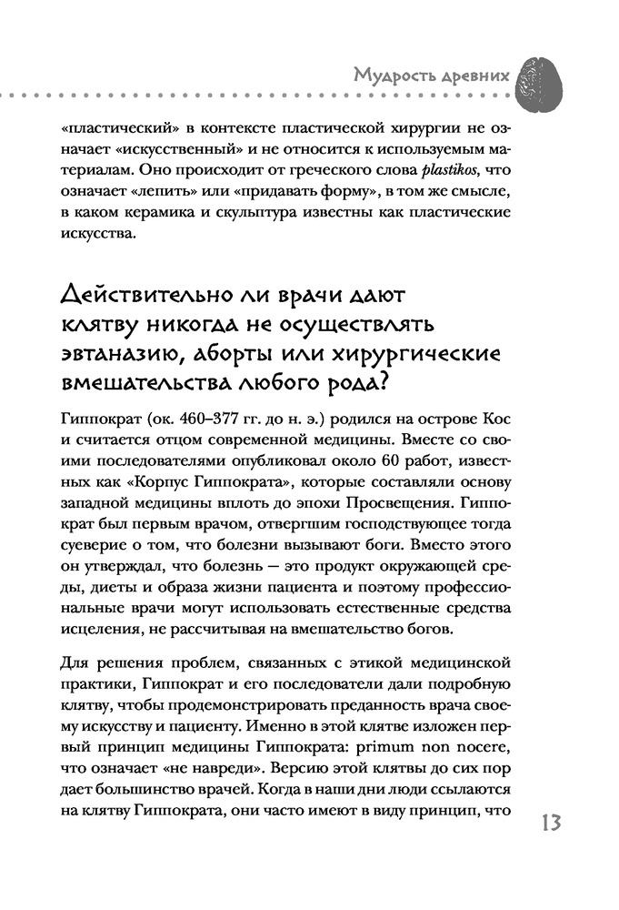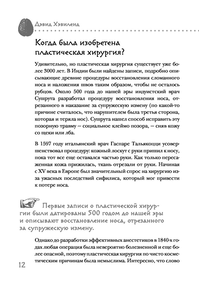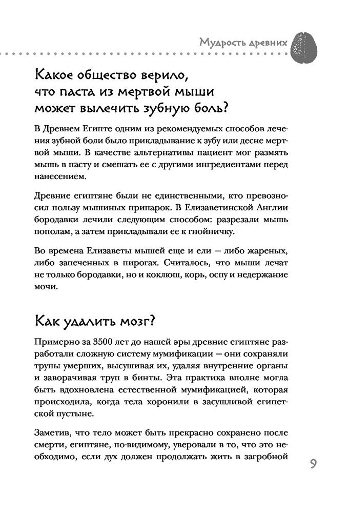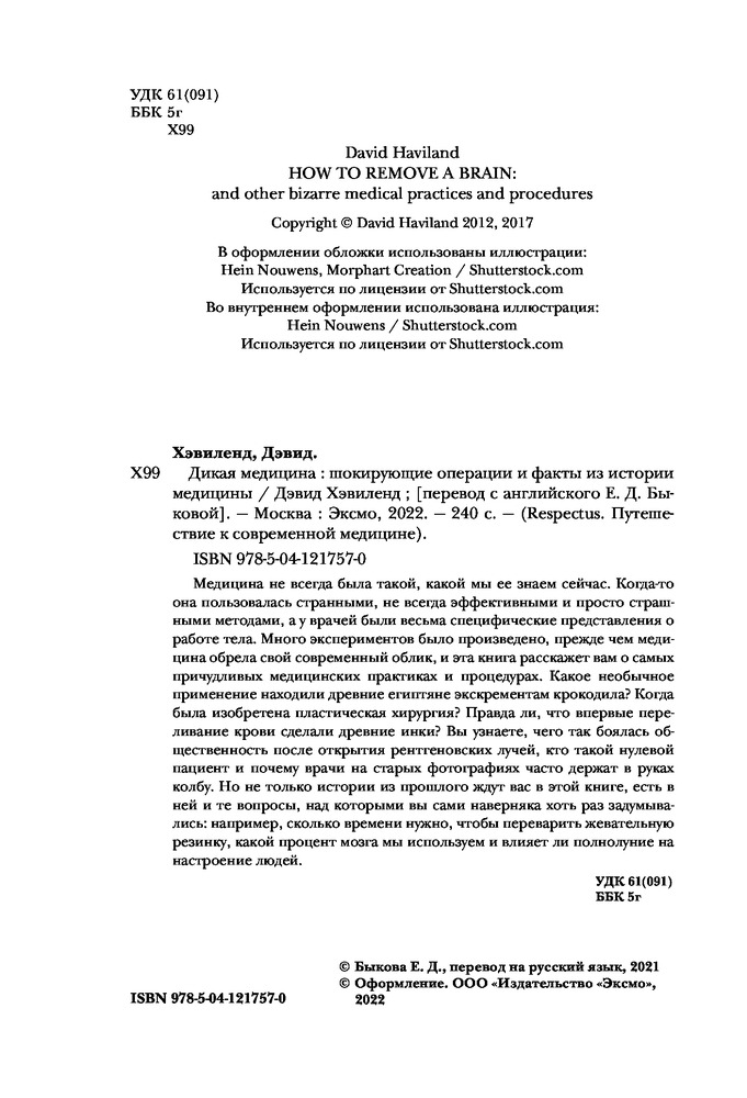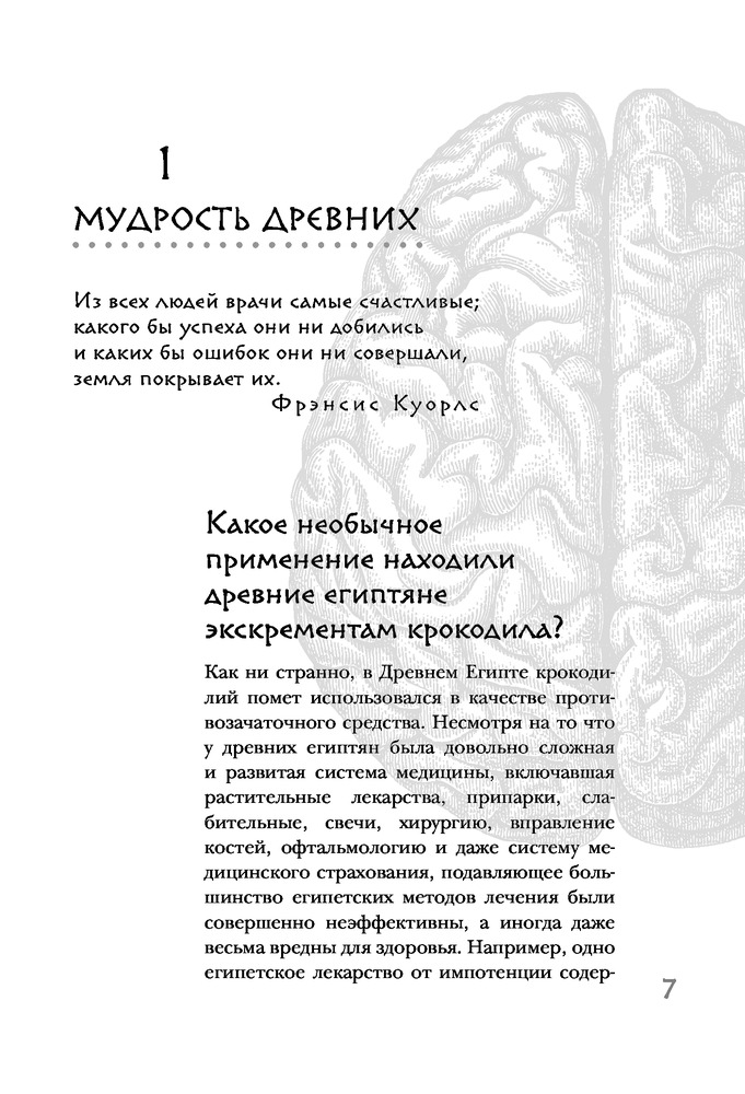 Дикая медицина. Шокирующие операции и факты из истории медициныВ данный момент этот товар отсутствует в продаже. Возможно, у нас найдется аналогичный или похожий товар здесь. Серия: Respectus. Путешествие к современной медицине Медицина не всегда была такой, какой мы ее знаем сейчас. Когда-то она пользовалась странными, не всегда эффективными и просто страшными методами, а у врачей были весьма специфические представления о работе тела. Много экспериментов было произведено, прежде чем медицина обрела свой современный облик, и эта книга расскажет вам о самых причудливых медицинских практиках и процедурах. Какое необычное применение находили древние египтяне экскрементам крокодила? Когда была изобретена пластическая хирургия? Правда ли, что впервые переливание крови сделали древние инки? Вы узнаете, чего так боялась общественность после открытия рентгеновских лучей, кто такой нулевой пациент и почему врачи на старых фотографиях часто держат в руках колбу. Но не только истории из прошлого ждут вас в этой книге, есть в ней и те вопросы, над которыми вы сами наверняка хоть раз задумывались: например, сколько времени нужно, чтобы переварить жевательную резинку, какой процент мозга мы используем, и влияет ли полнолуние на настроение людей. |