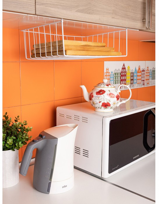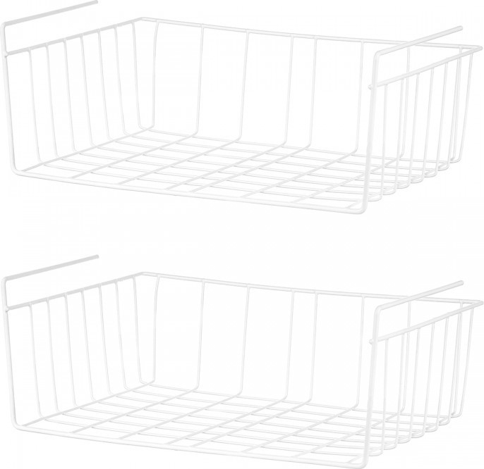Подвесная корзинка организовала пространство полки и в кухонном шкафу, и в шкафу для одежды.