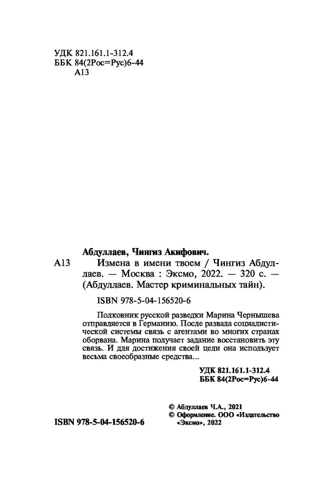 💳 Оплатить за товар можно при получении 🇰🇿 Есть бесплатная доставка по Казахстану 🎁 Копите бонусы с каждой покупки Серия: Абдуллаев. Мастер криминальных тайн (обложка) Полковник русской разведки Марина Чернышева отправляется в Германию. После развала социалистической системы связь с агентами во многих странах оборвана. Марина получает задание восстановить эту связь. И для достижения своей цели она использует весьма своеобразные средства... |