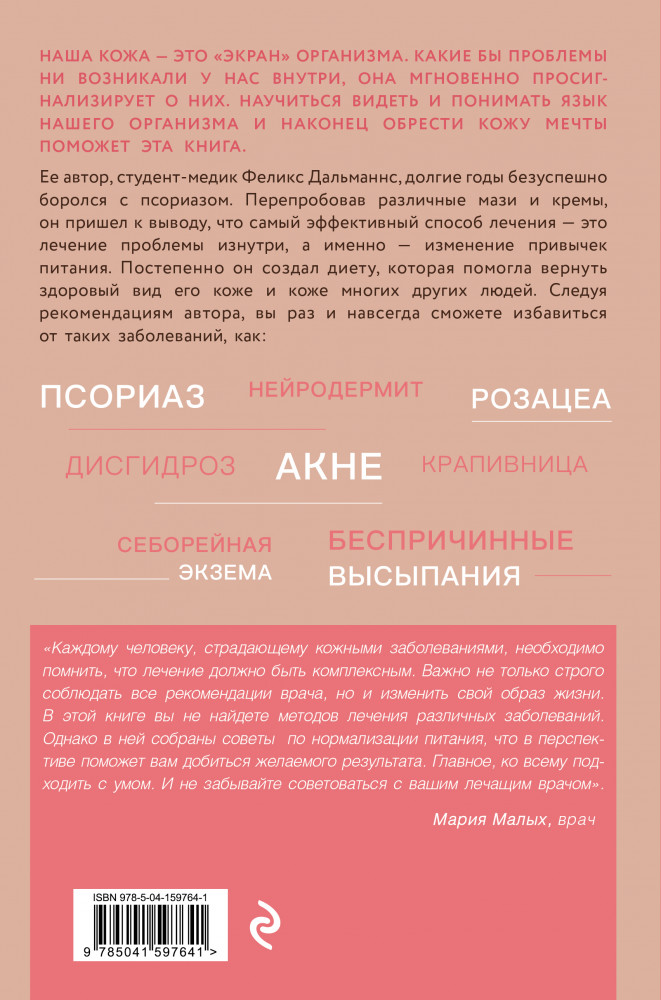 Система питания, которую предлагает автор, оказывает благотворное влияние на состояние организма в целом, благодаря чему помогает избавиться от проявлений псориаза, нейродермита и акне и других заболеваний нашего самого крупного органа.