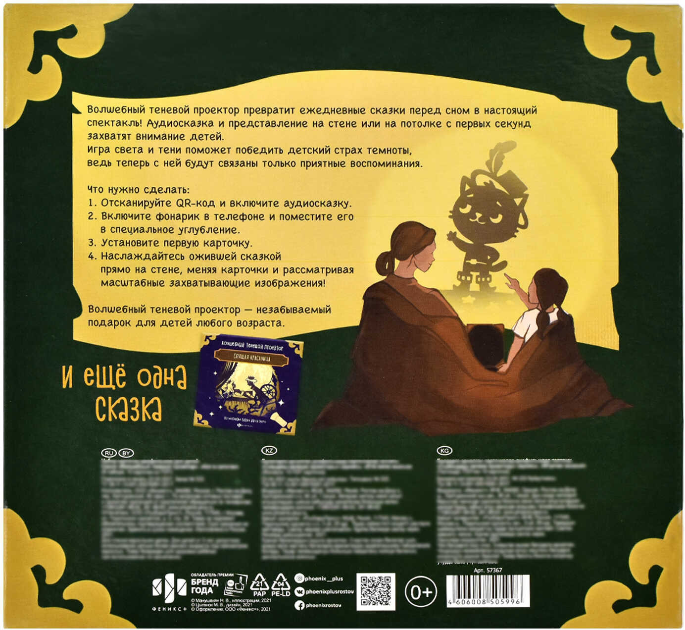 Феникс + Набор карточек-диафильм «Кот в сапогах»В данный момент этот товар отсутствует в продаже. Возможно, у нас найдется аналогичный или похожий товар здесь. Серия: Волшебный теневой проектор «Волшебный теневой проектор» превратит ежедневные сказки перед сном в настоящий спектакль! С первых секунд внимание детей захватят аудиосказка и представление на стене или на потолке. Игра света и тени поможет победить детский страх темноты, ведь теперь с ней будут связаны только приятные воспоминания. |