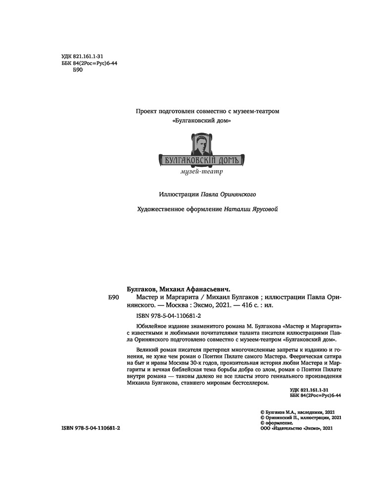 Мастер и МаргаритаВ данный момент этот товар отсутствует в продаже. Возможно, у нас найдется аналогичный или похожий товар здесь. Серия: Подарочные издания. Коллекция классики Юбилейное издание знаменитого романа М. Булгакова «Мастер и Маргарита» с известными и любимыми почитателями таланта писателя иллюстрациями Павла Оринянского подготовлено совместно с музеем-театром «Булгаковский дом». Великий роман писателя претерпел многочисленные запреты к изданию и гонения, не хуже чем судьба романа о Понтии Пилате самого Мастера. Феерическая сатира на быт и нравы Москвы 30-х годов, пронзительная история любви Мастера и Маргариты и вечная библейская тема борьбы добра со злом, роман о Понтии Пилате внутри романа — таковы далеко не все пласты этого гениального произведения Михаила Булгакова, ставшего мировым бестселлером. |