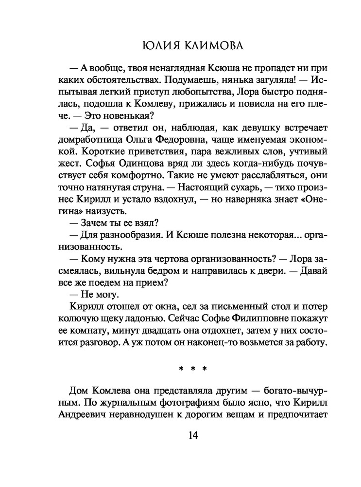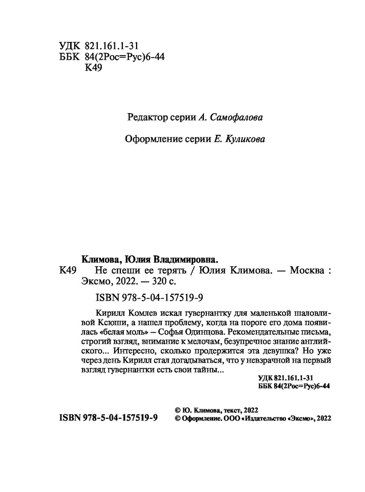 💳 Оплатить за товар можно при получении 🇰🇿 Есть бесплатная доставка по Казахстану 🎁 Копите бонусы с каждой покупки Серия: Диагноз: любовь (обложка) Кирилл Комлев искал гувернантку для маленькой шаловливой Ксюши, а нашел проблему, когда на пороге его дома появилась «белая моль» — Софья Одинцова. Рекомендательные письма, строгий взгляд, внимание к мелочам, безупречное знание английского... Интересно, сколько продержится эта девушка? Но уже через день Кирилл стал догадываться, что у невзрачной на первый взгляд гувернантки есть свои тайны... |
