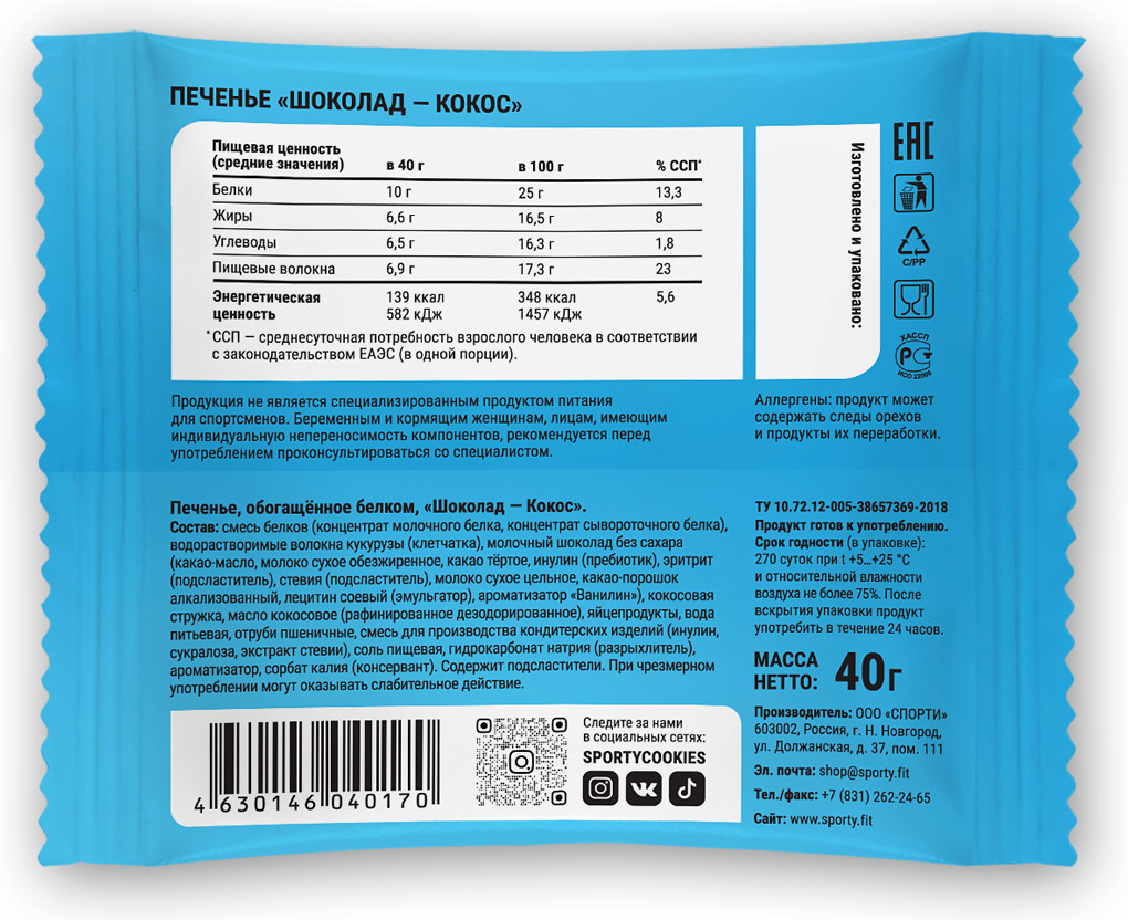 Sporty Печенье протеиновое без сахара «Шоколад-кокос»