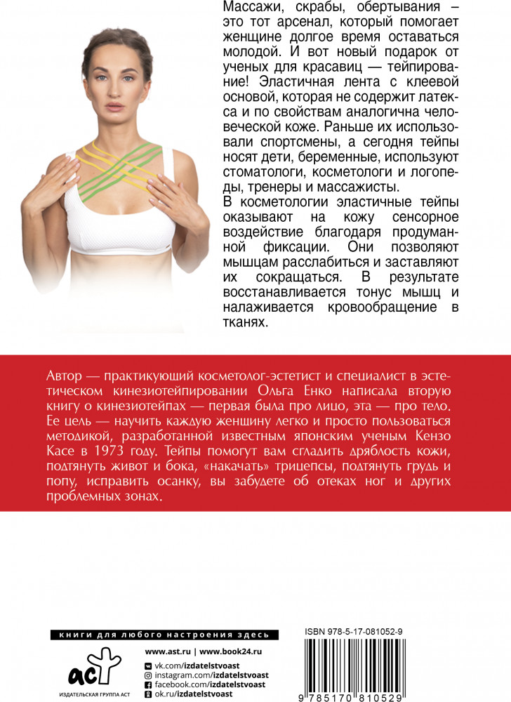 Тейпирование тела. Худеем без усилийВ данный момент этот товар отсутствует в продаже. Возможно, у нас найдется аналогичный или похожий товар здесь. Серия: Звезда тренинга Уколы красоты, массажи, скрабы, обертывания — это тот арсенал, который помогает женщине долгое время оставаться молодой. И вот новый подарок от ученых для красавиц — тейпирование! Эластичная лента с клеевой основой, которая не содержит латекса и по свойствам аналогична человеческой коже. Раньше его использовали спортсмены, а сегодня тейпы носят дети, беременные, используют стоматологи, косметологи и логопеды, тренеры и массажисты.В косметологии эластичные тейпы на кожу оказывают сенсорное воздействие благодаря продуманной фиксации. Они позволяют мышцам расслабиться и заставляют их сокращаться. В результате у них восстанавливается тонус и налаживается кровообращение в тканях.Техника кинезиотепирования в домашних условиях, понятные схемы и иллюстрации для каждой зоны тела.Моя новая книга — это логичное продолжение изучения техники эстетического тейпирования. От лица мы переходим к телу, ведь тейпирование решает проблемы не только на лице, но и на теле:- лишние килограммы;- дряблость кожи;- целлюлит;- диастаз;- растяжки;- свисающий живот;- растущая косточка на ноге;- "холка";- проблемы с осанкой;- отеки конечностей. |