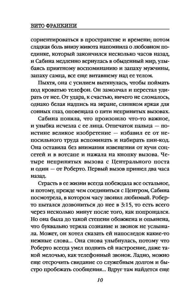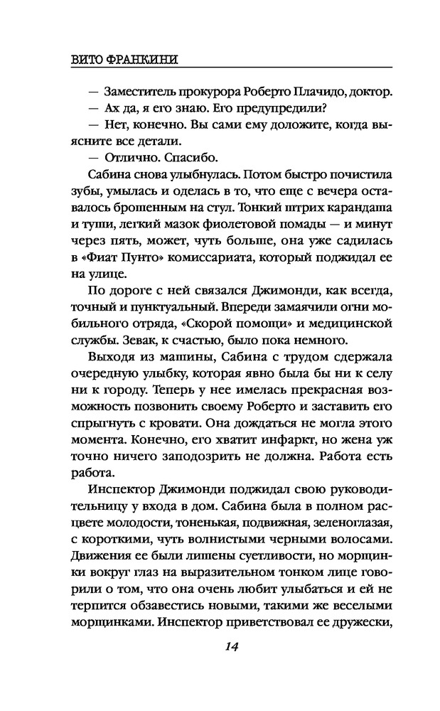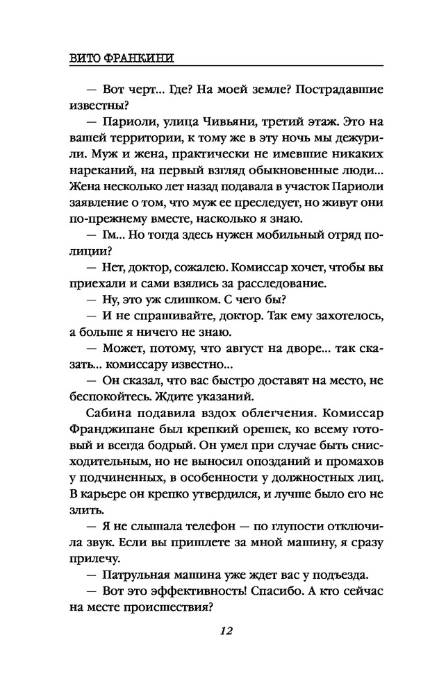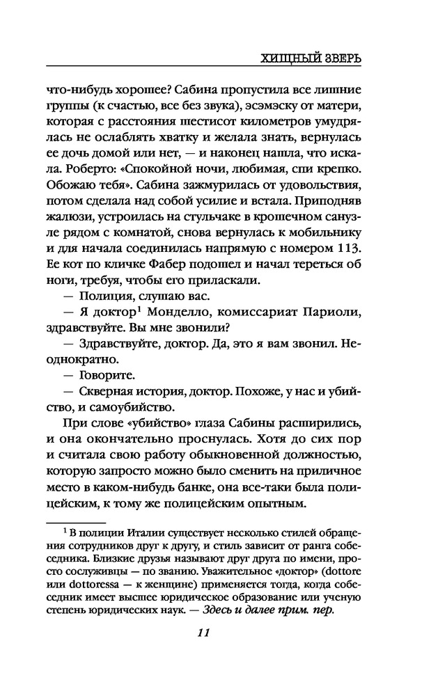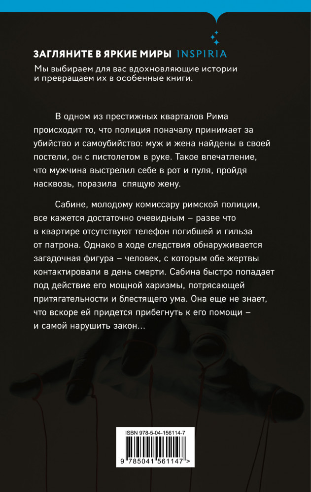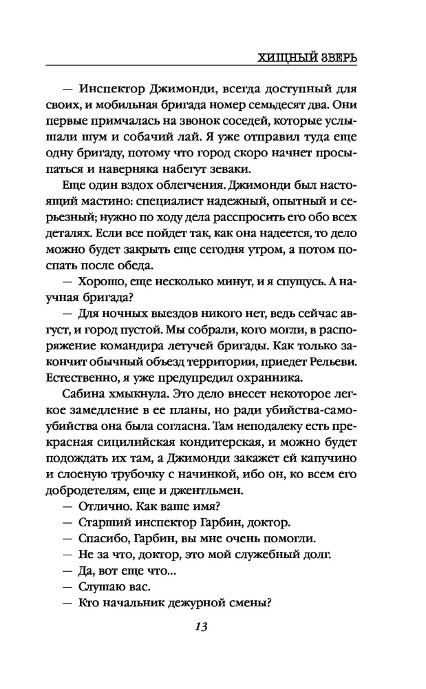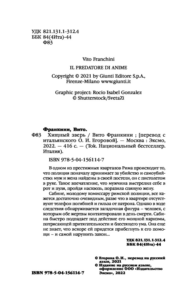 Хищный зверьВ данный момент этот товар отсутствует в продаже. Возможно, у нас найдется аналогичный или похожий товар здесь. Серия: Tok. Национальный бестселлер. Италия В одном из престижных кварталов Рима происходит то, что полиция поначалу принимает за убийство и самоубийство: муж и жена найдены в своей постели, он с пистолетом в руке. Такое впечатление, что мужчина выстрелил себе в рот, и пуля, пройдя насквозь, поразила спящую жену. Сабине, молодому комиссару римской полиции, все кажется достаточно очевидным — разве что в квартире отсутствуют телефон погибшей и гильза от патрона. Однако в ходе следствия обнаруживается загадочная фигура — человек, с которым обе жертвы контактировали в день смерти. Сабина быстро попадает под действие его мощной харизмы, потрясающей притягательности и блестящего ума. Она еще не знает, что вскоре ей придется прибегнуть к его помощи — и самой нарушить закон... |