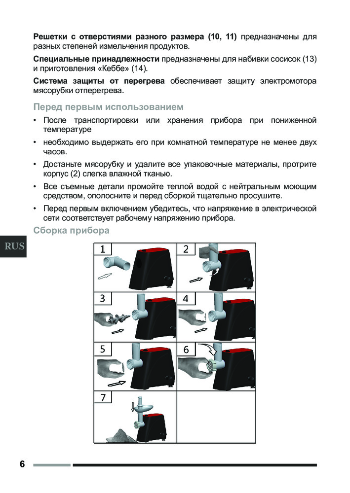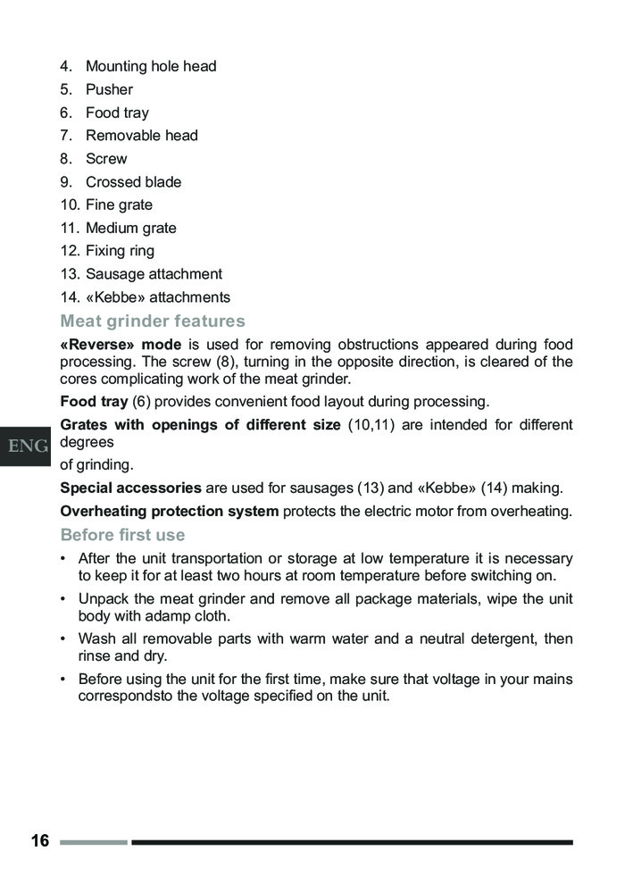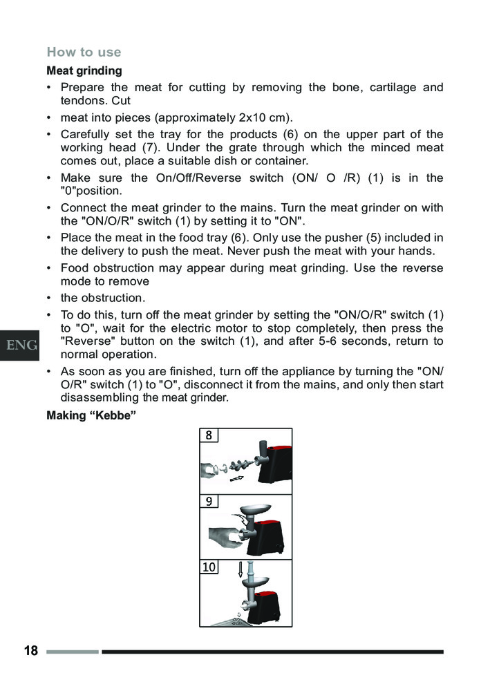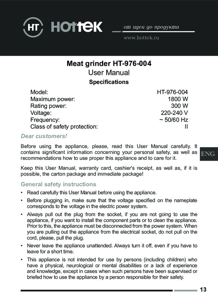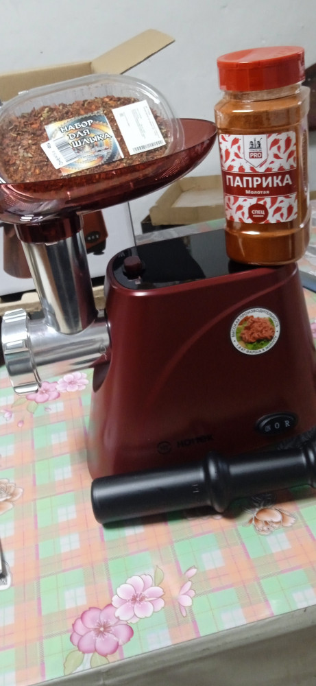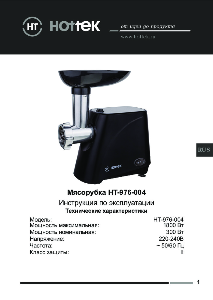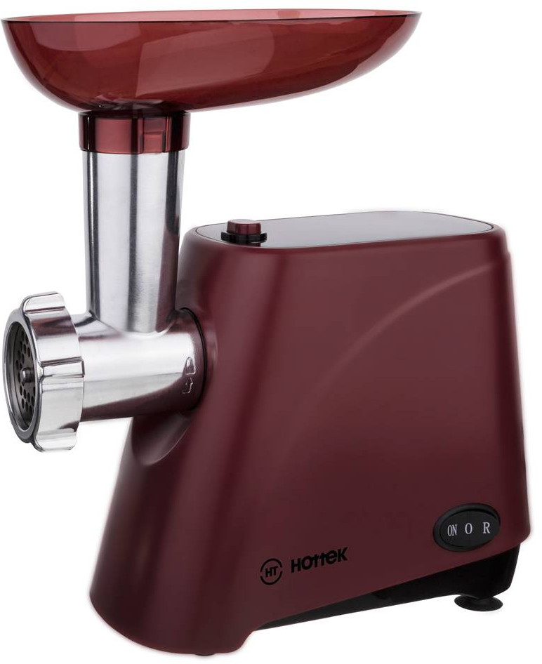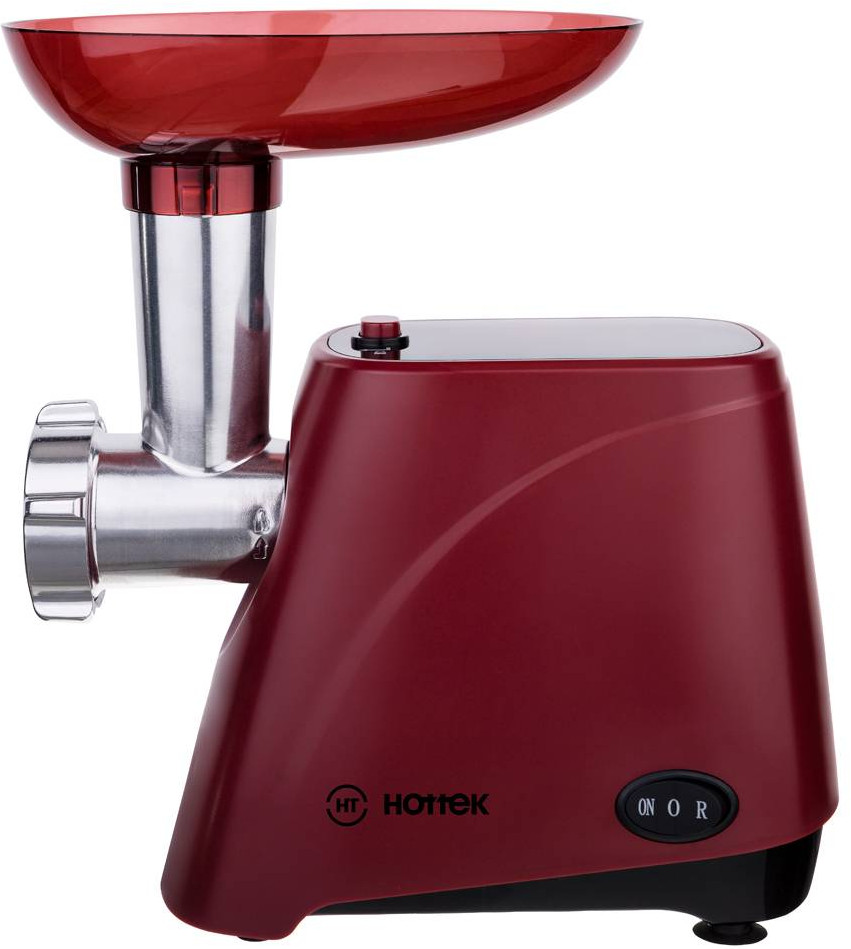 Мясорубка HT-976-004 выполнена из высококачественного пластика, в бордовом цвете — для тех, кто любит нестандартные (классические) цветовые решения на кухне. Максимальная (пиковая) мощность мясорубки составляет 1800 Вт, номинальная 300 Вт. Производительность — 1,8 кг фарша в минуту. Функция реверс (обратный ход) поможет очистить шнек от жил или случайно попавшей косточки. Внутренние детали — шнек, ножи, решетки — сделаны из металла, это плюс, поскольку на них ложится вся нагрузка при работе электрической мясорубки. Имеется защита от перегрева. В комплект поставки входят 2 диска для приготовления фарша, насадки для приготовления кеббе и сосисок.