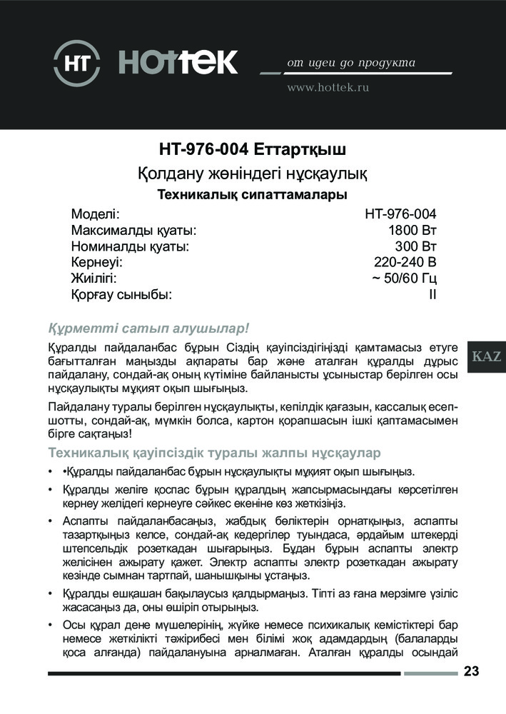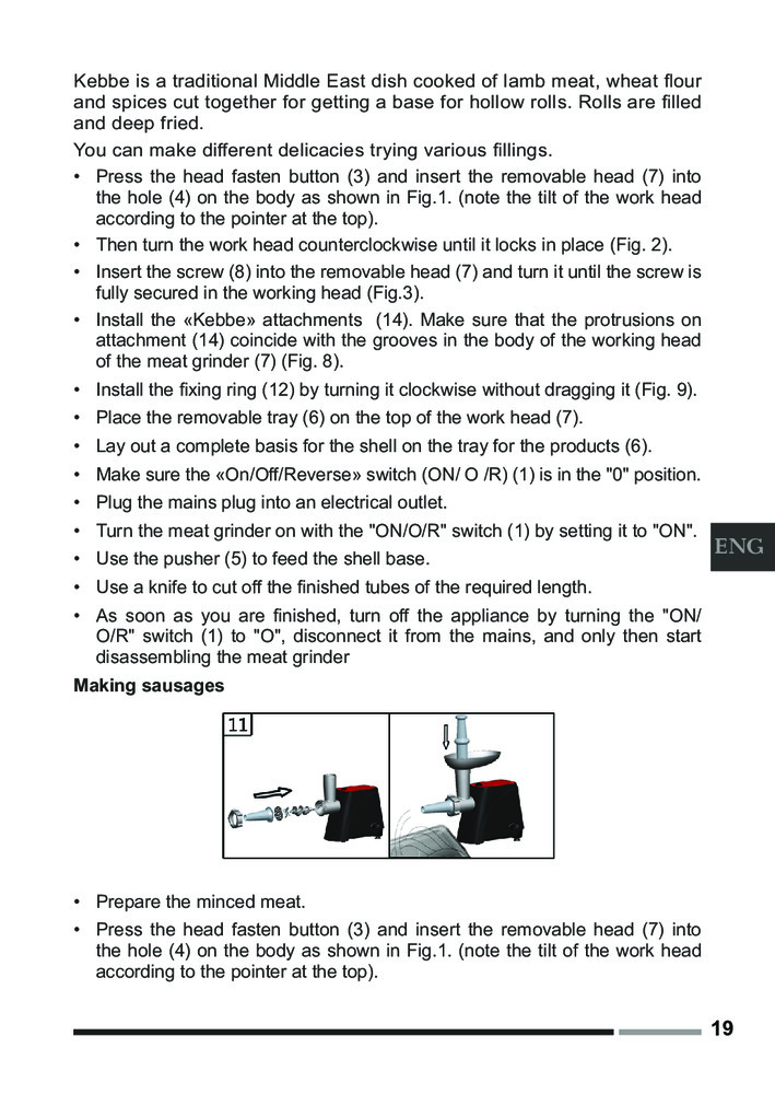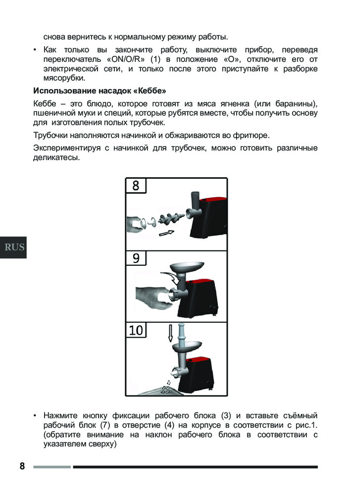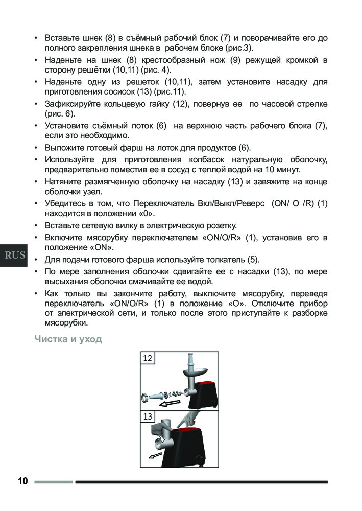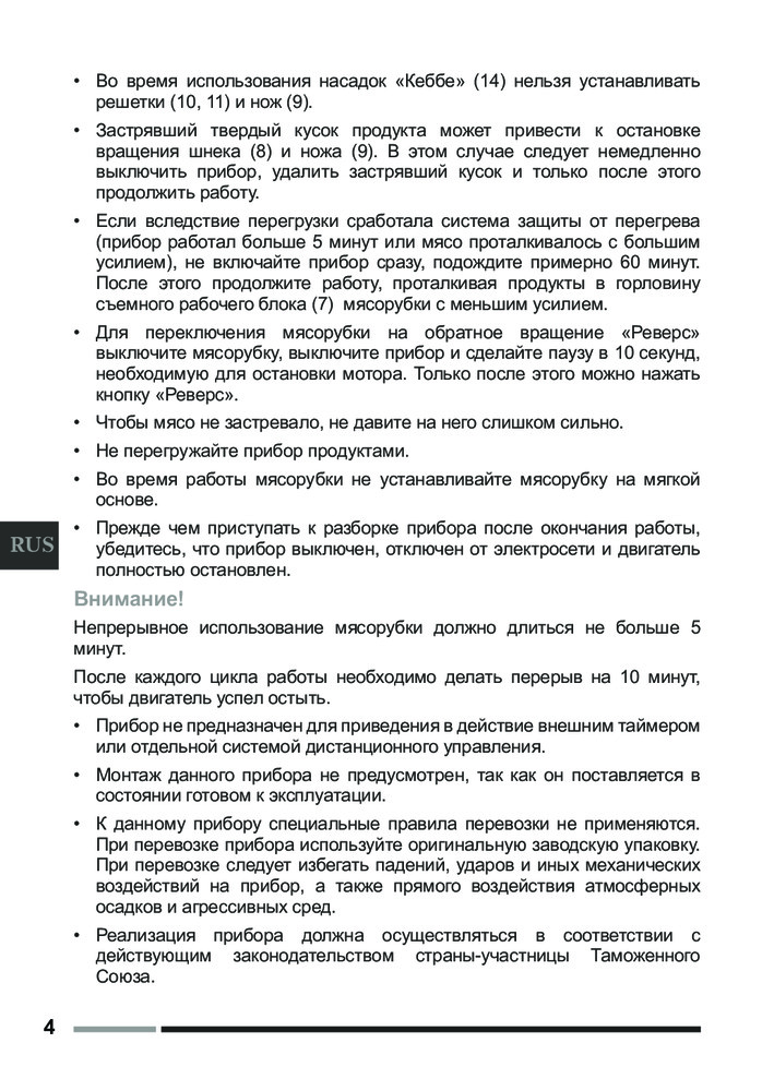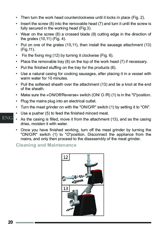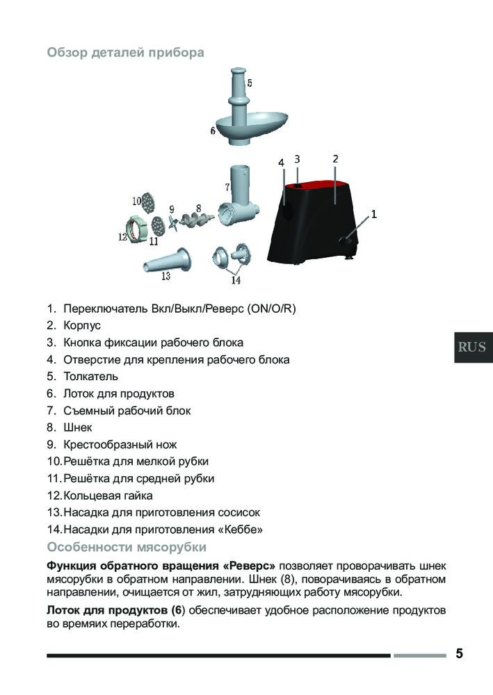 Мясорубка HT-976-004 выполнена из высококачественного пластика, в бордовом цвете — для тех, кто любит нестандартные (классические) цветовые решения на кухне. Максимальная (пиковая) мощность мясорубки составляет 1800 Вт, номинальная 300 Вт. Производительность — 1,8 кг фарша в минуту. Функция реверс (обратный ход) поможет очистить шнек от жил или случайно попавшей косточки. Внутренние детали — шнек, ножи, решетки — сделаны из металла, это плюс, поскольку на них ложится вся нагрузка при работе электрической мясорубки. Имеется защита от перегрева. В комплект поставки входят 2 диска для приготовления фарша, насадки для приготовления кеббе и сосисок.
