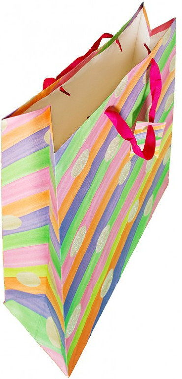 Для пакетов используется высококачественная плотная бумага с хорошим качеством печати рисунка, высокая плотность бумаги позволяет изделию прекрасно сохранять первоначальную форму. В процессе использования пакеты не расклеиваются и не рвутся, в качестве ручек для пакета используется атласная лента, закрепленная стопорами с внутренней стороны пакета. Пакет дополнен бумажными подвесами на ручках.