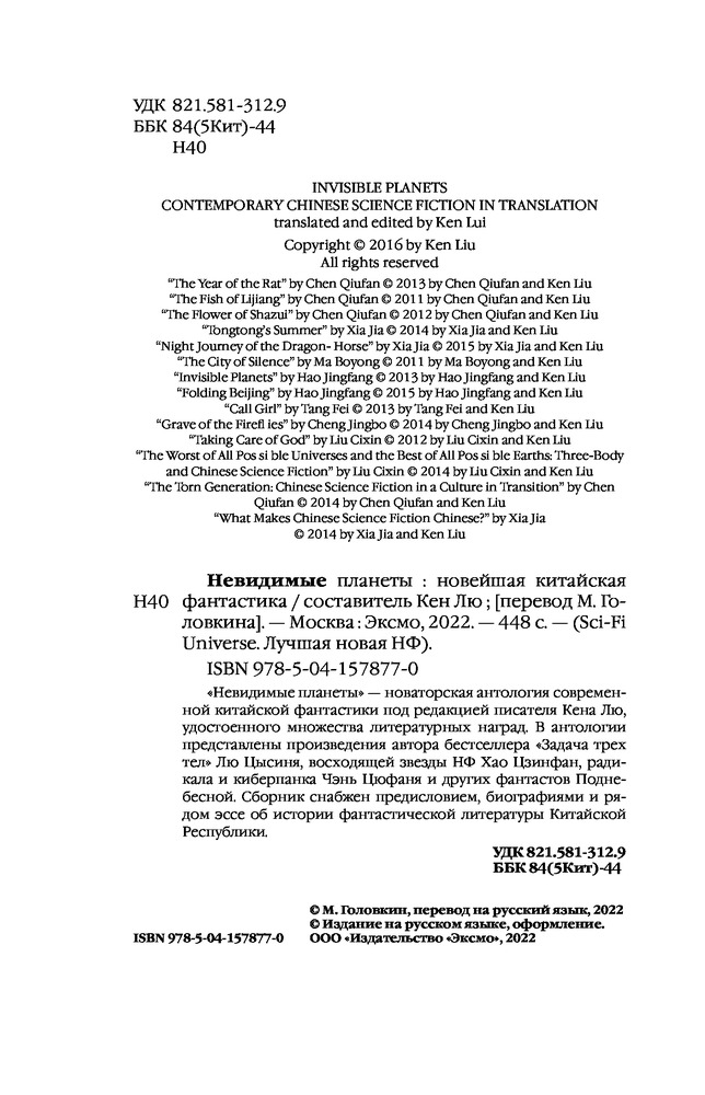 💳 Оплатить за товар можно при получении 🇰🇿 Есть бесплатная доставка по Казахстану 🎁 Копите бонусы с каждой покупки Серия: Sci-Fi Universe. Лучшая новая НФ Финалист премии «Локус». «Невидимые планеты» — новаторская антология современной китайской фантастики под редакцией писателя Кена Лю. |