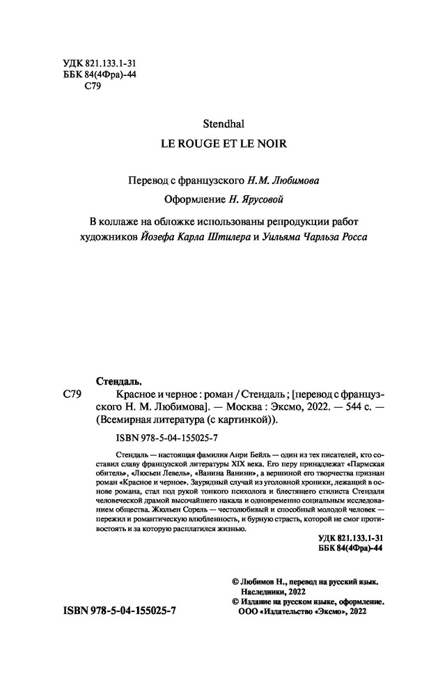 Серия: Всемирная литература (новое оформление) Стендаль — настоящая фамилия Анри Бейль — один из тех писателей, кто составил славу французской литературы XIX века. Его перу принадлежат «Пармская обитель», «Люсьен Левель», «Ванина Ванини», а вершиной его творчества признан роман «Красное и черное». Заурядный случай из уголовной хроники, лежащий в основе романа, стал под рукой тонкого психолога и блестящего стилиста Стендаля человеческой драмой высочайшего накала и одновременно социальным исследованием общества. Жюльен Сорель — честолюбивый и способный молодой человек — пережил и романтическую влюбленность, и бурную страсть, которой не смог противостоять и за которую расплатился жизнью. |