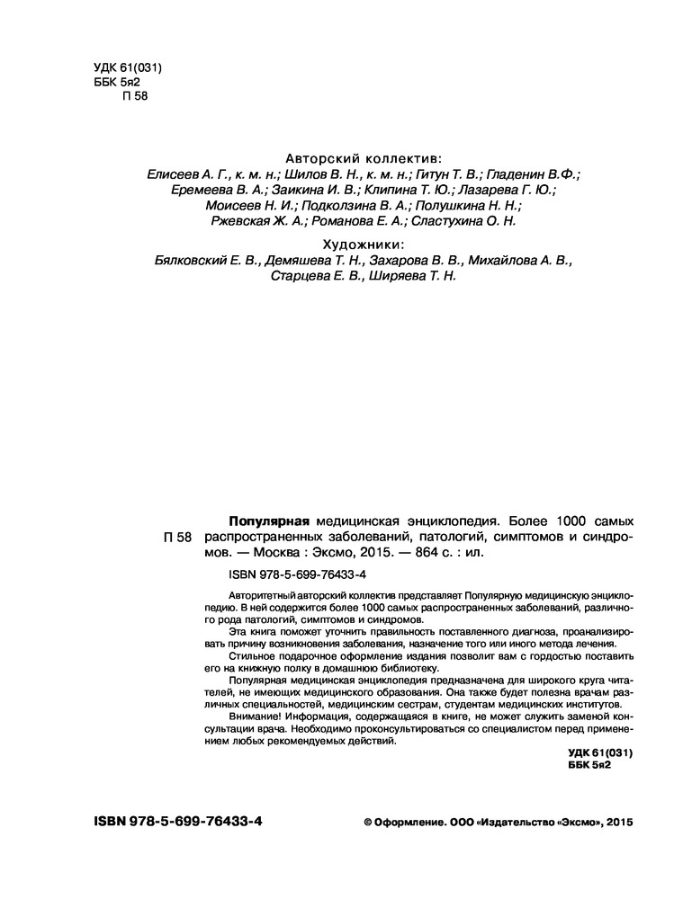 Авторитетный авторский коллектив представляет Популярную медицинскую энциклопедию. В ней содержится более 1000 самых распространенных заболеваний, различного рода патологий, симптомов и синдромов.