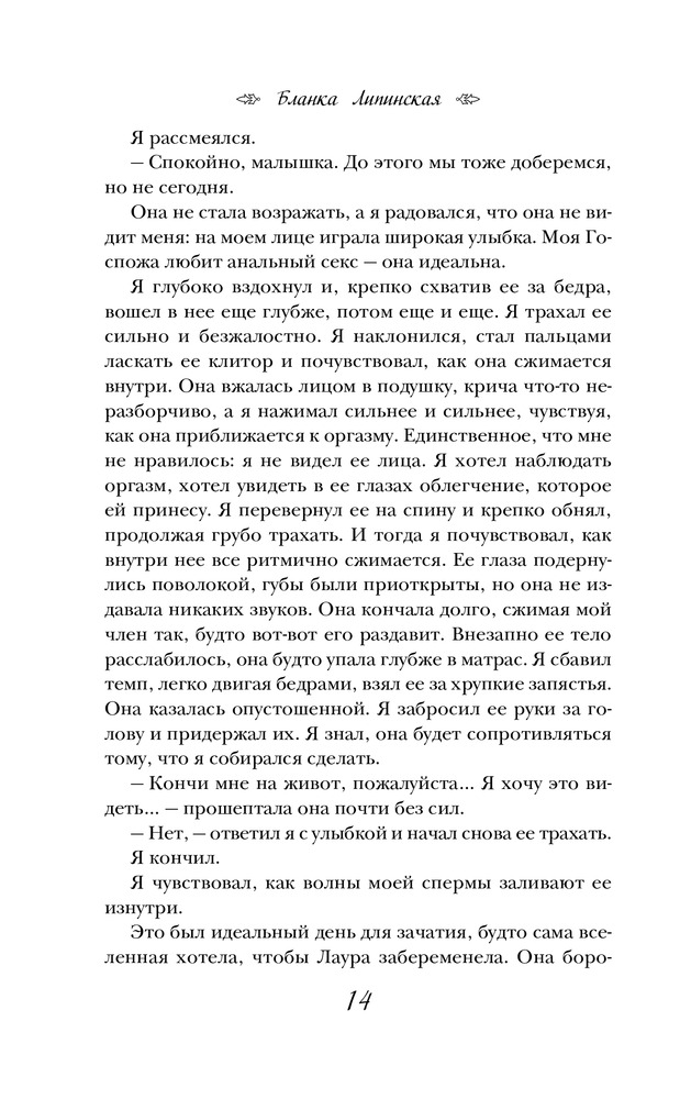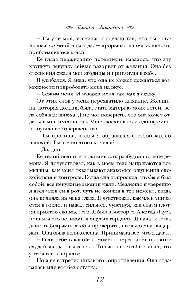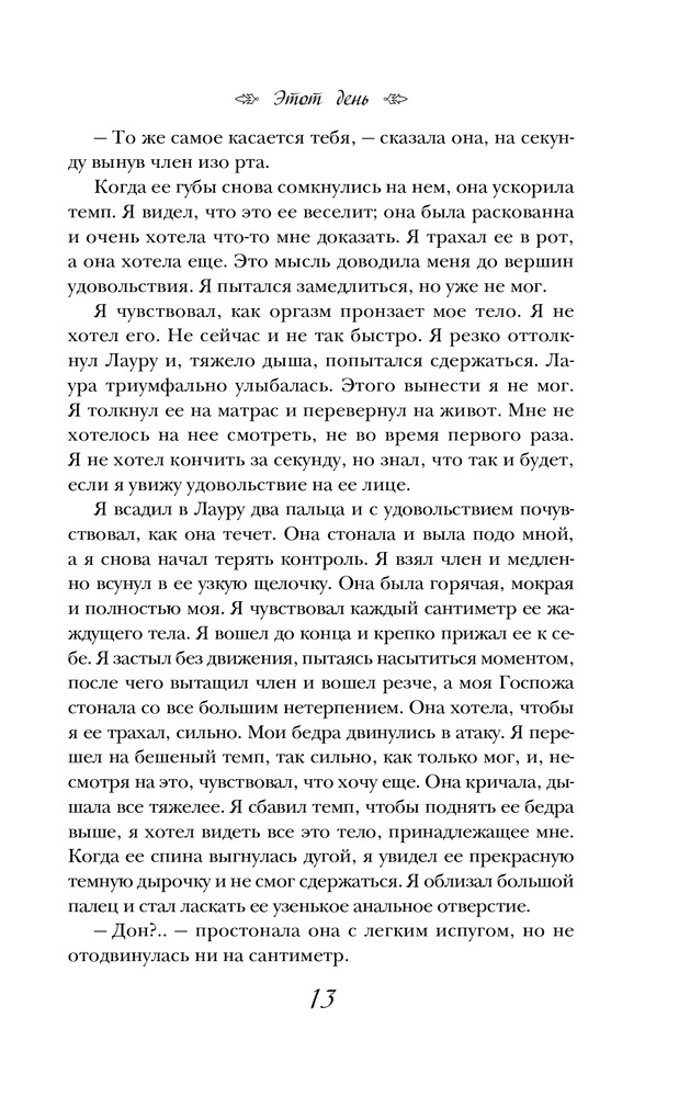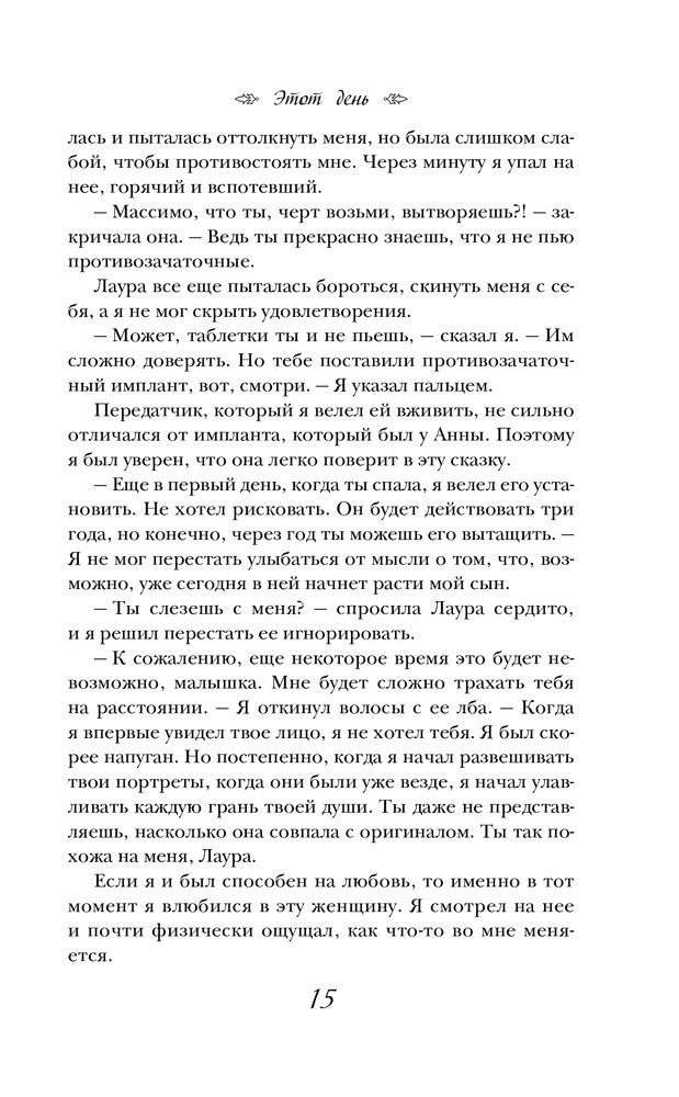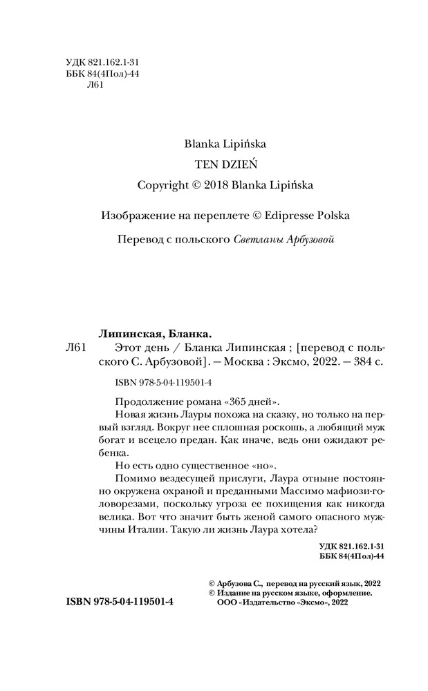 Этот деньВ данный момент этот товар отсутствует в продаже. Возможно, у нас найдется аналогичный или похожий товар здесь. Серия: 365 дней. Самая горячая история Продолжение романа «365 дней». Новая жизнь Лауры похожа на сказку, но только на первый взгляд. Вокруг нее сплошная роскошь, а любящий муж богат и всецело предан. Как иначе, ведь они ожидают ребенка. Но есть одно существенное «но». Помимо вездесущей прислуги, Лаура отныне постоянно окружена охраной и преданными Массимо мафиози-головорезами, поскольку угроза ее похищения как никогда велика. Вот что значит быть женой самого опасного мужчины Италии. Такую ли жизнь Лаура хотела? |