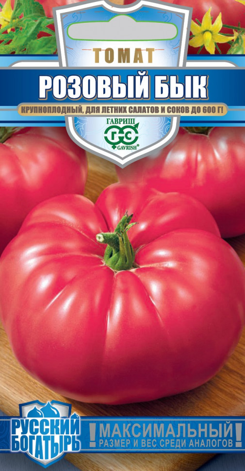 Серия: Русский богатырь Томат Розовый бык — крупноплодный, урожайный сорт для выращивания в теплицах и открытом грунте (южные регионы). Растение индетерминантное нуждается в опоре. Созревает через 110-115 дней после всходов. Плоды плоскоокруглые, массой 250-300 г (до 600 г). Мясистые, сладкие, ароматные с нежной, сочной мякотью. Спелые томаты розового цвета, идеальны для летних салатов, приготовления сока и пасты. Посев на рассаду проводят в марте. Пикировка — в фазе первого настоящего листа. Высадка рассады в теплицы — в начале-середине мая в возрасте 40-45 дней (если апрель теплый, то высадка рассады возможна в конце апреля). Формируют в один стебель, удаляя все «пасынки». В конце вегетации прищипывают точку роста. Устойчив к основным болезням томата. Семена сохраняют всхожесть в течение 10 лет при оптимальных условиях хранения. Рекомендуется увеличить норму высева по окончании срока годности. |