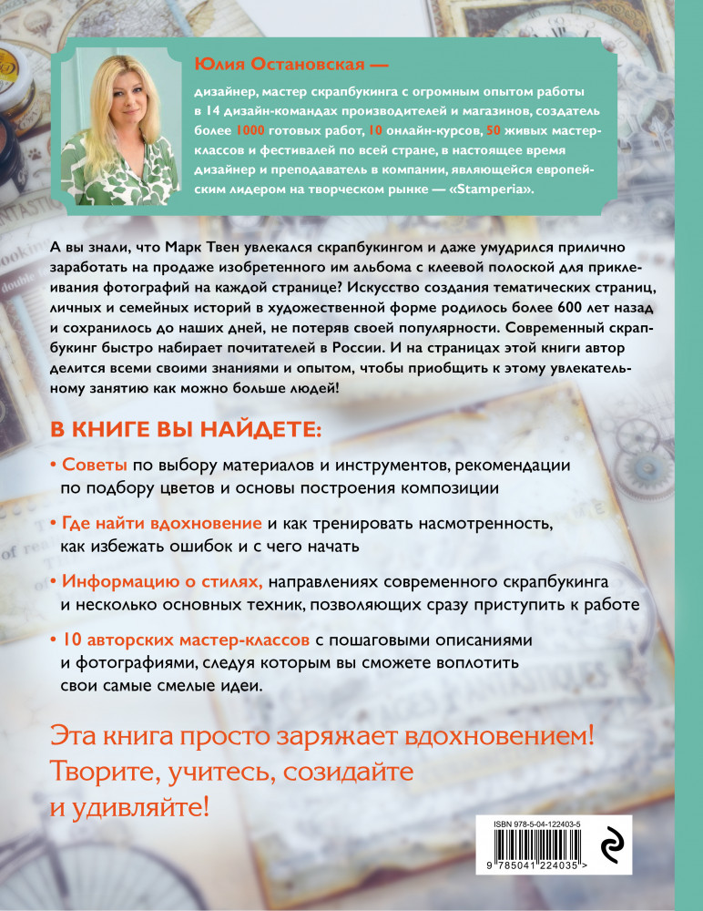 И на страницах этой книги автор, мастер скрапбукинга с огромным опытом, дизайнер и преподаватель в «Stamperia» — компании-лидере на творческом рынке Европы, делится всеми своими знаниями, чтобы приобщить к этому увлекательному занятию как можно больше людей!