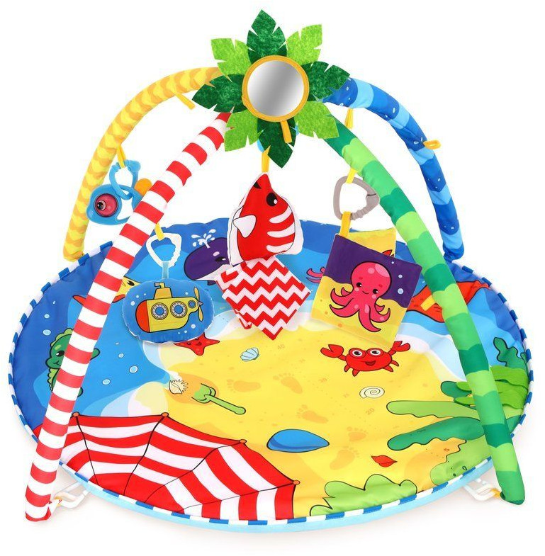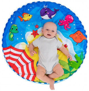 • 6 месяцев и старше. Когда кроха научится сидеть, дуги можно будет снять и использовать коврик как тёплый и мягкий пол для игр. А с 9-ти месяцев дизайн коврика можно использовать как игровое обучающее пространство. Например, выучить с малышом названия цветов и названия забавных морских обитателей, изображенных на коврике. Или устроить весёлую фотосессию!