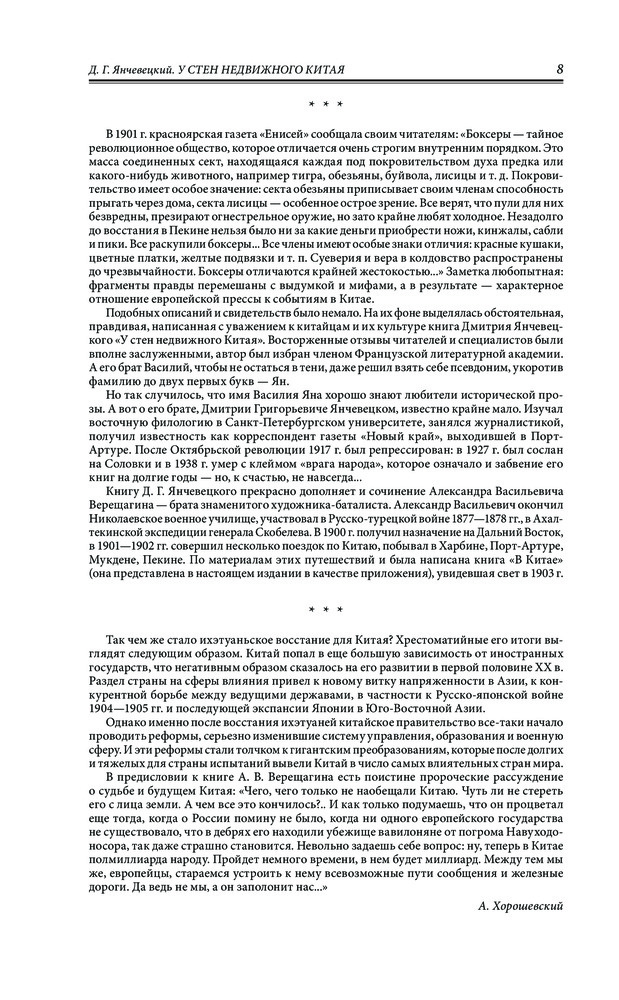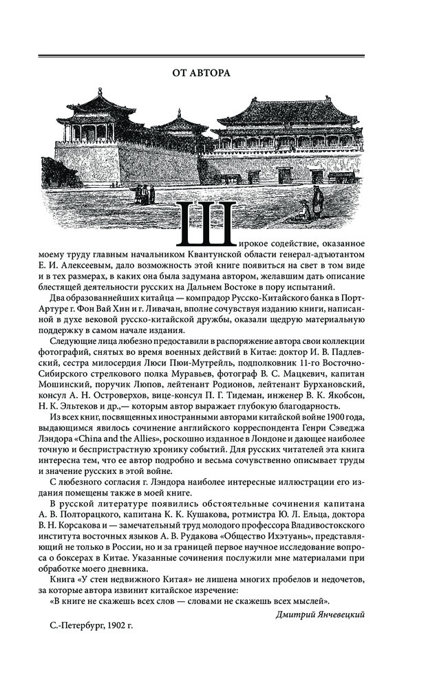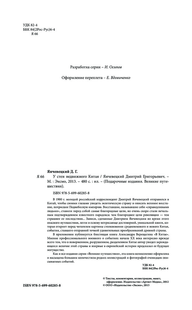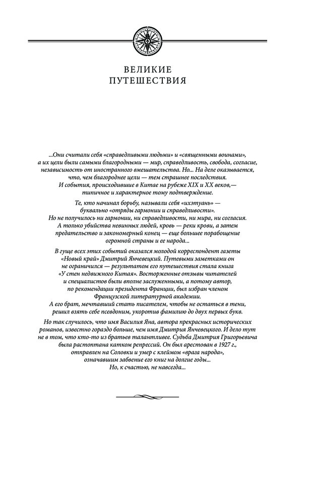У стен недвижного КитаяДмитрий Григорьевич Янчевецкий В данный момент этот товар отсутствует в продаже. Возможно, у нас найдется аналогичный или похожий товар здесь. Серия: Подарочные издания. Великие путешествия В 1900 г. молодой российский корреспондент Дмитрий Янчевецкий отправился в Китай, чтобы своими глазами увидеть экзотическую страну и описать великое восстание, потрясшее Поднебесную империю. Восставшие, называвшие себя «справедливыми людьми», ставили перед собой самые благородные цели, но очень скоро стали печальным подтверждением известного парадокса: чем благороднее цели революции — тем страшнее ее последствия... Записи, сделанные Дмитрием Янчевецким во время этого опасного путешествия, легли в основу потрясающе достоверной, уникальной книги, которая откроет перед читателем картины столкновения средневекового и нового Китая, события, ставшего отправной точкой удивительных преобразований древней страны. |