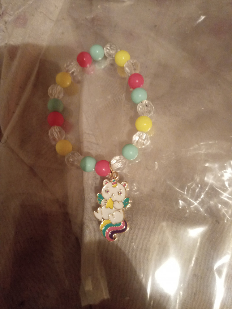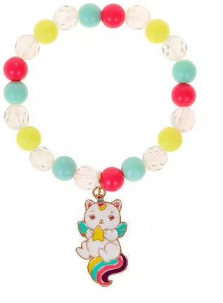 Браслетик состоит из круглых бусин прозрачного, малинового, жёлтого и бирюзового цвета и украшен подвеской в виде сказочного героя — котика-единорога, длина подвески 3 см.
