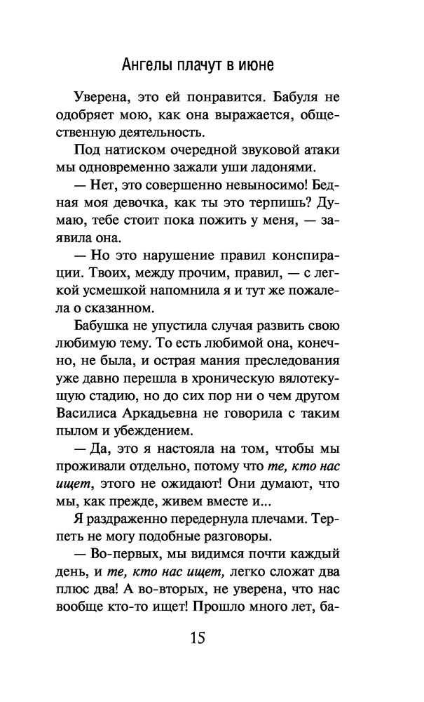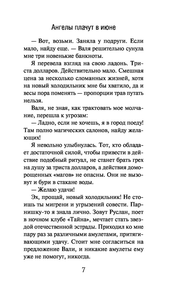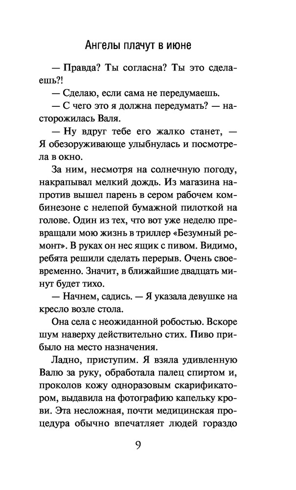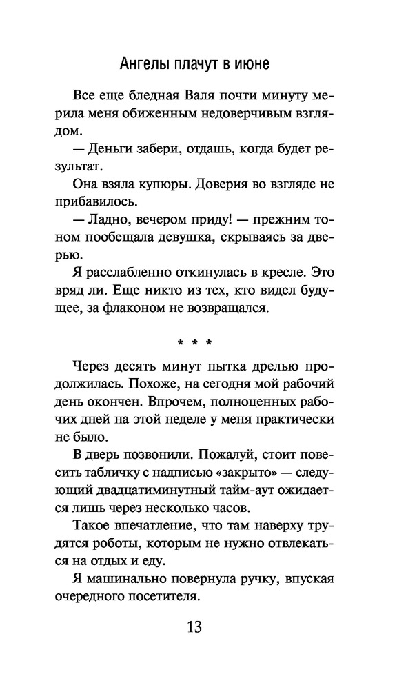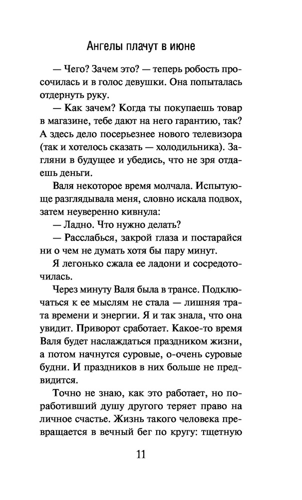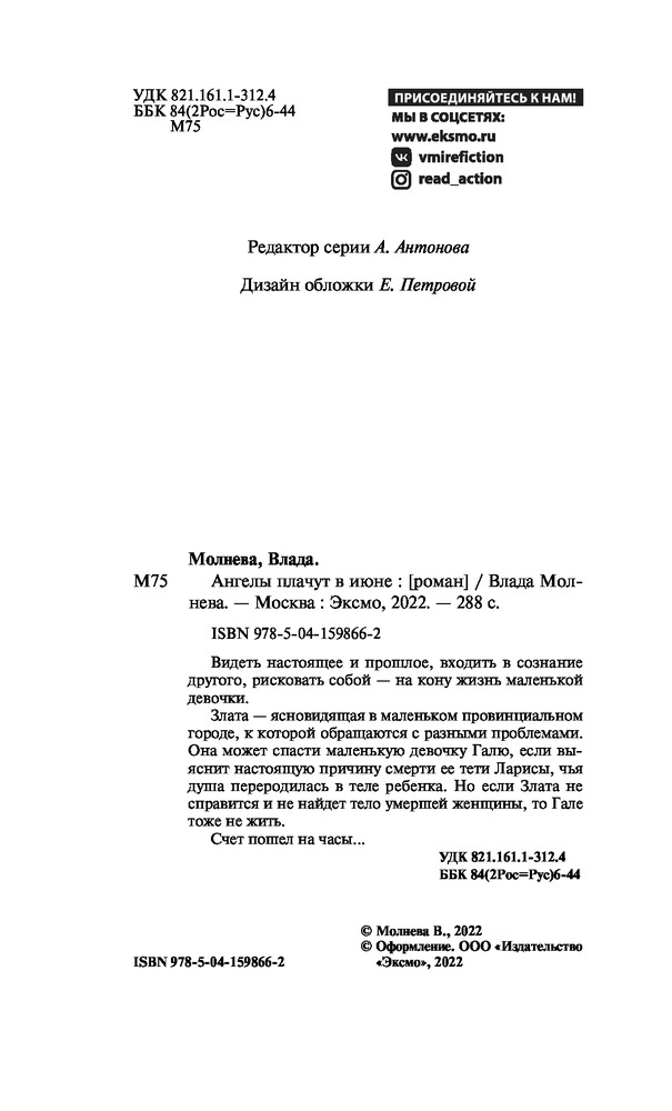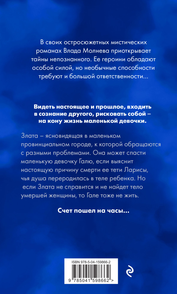 Ангелы плачут в июнеВ данный момент этот товар отсутствует в продаже. Возможно, у нас найдется аналогичный или похожий товар здесь. Серия: За гранью. Мистические триллеры Видеть настоящее и прошлое, входить в сознание другого, рисковать собой — на кону жизнь маленькой девочки. Злата — ясновидящая в маленьком провинциальном городе, к которой обращаются с разными проблемами. Она может спасти маленькую девочку Галю, если выяснит настоящую причину смерти ее тети Ларисы, чья душа переродилась в теле ребёнка. Но если Злата не справится и не найдет тело умершей женщины, то Гале тоже не жить. Счет пошел на часы... |