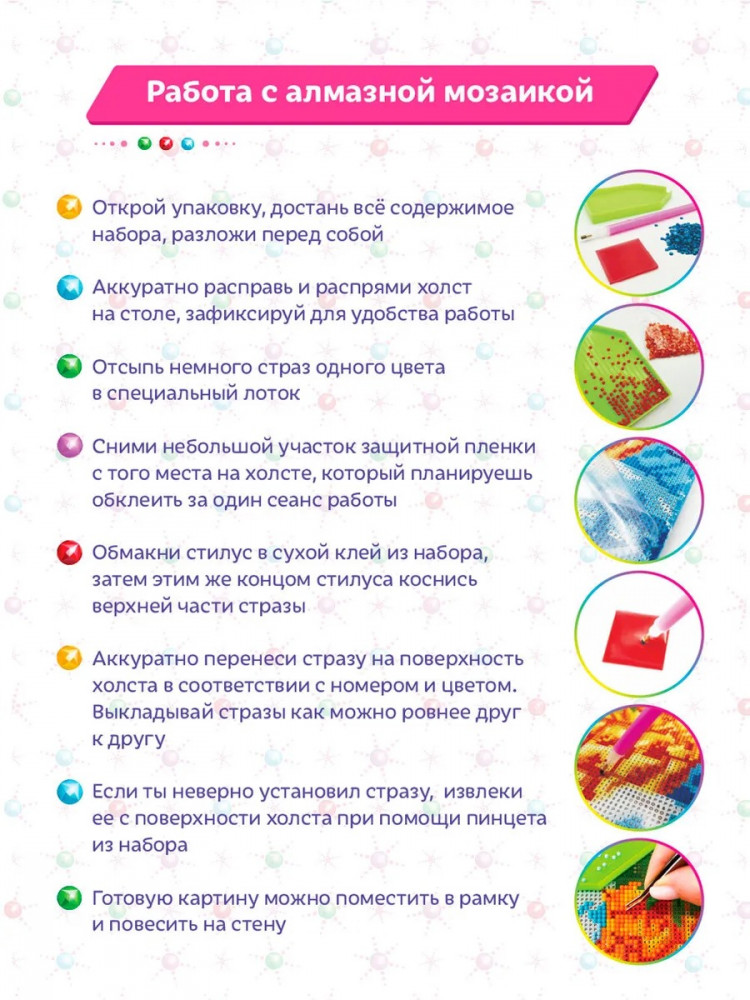 Специальный липкий слой для крепления страз на холсте обеспечивает простоту работы над картиной.