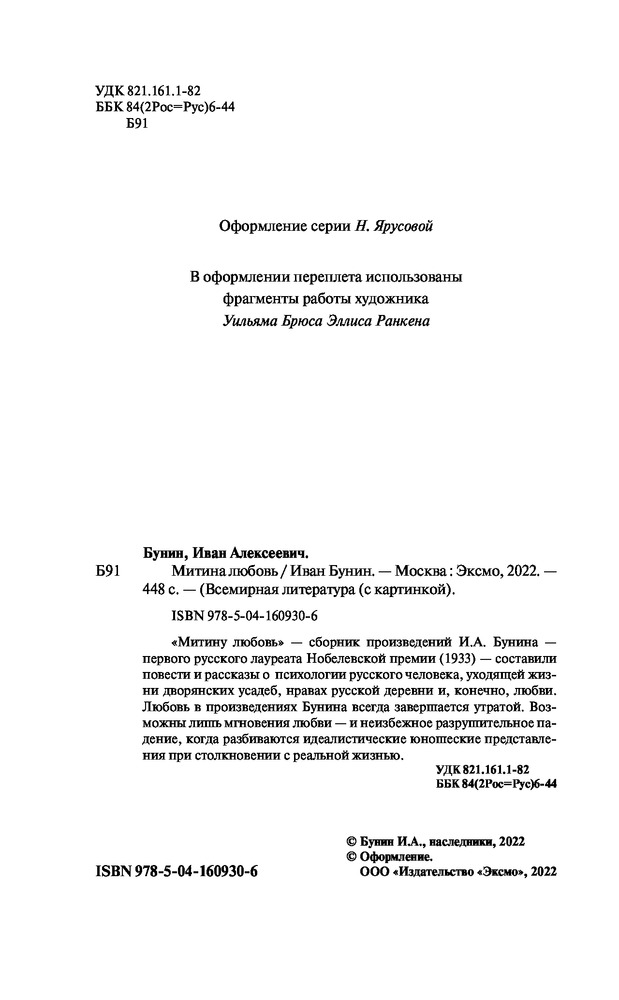 Серия: Всемирная литература (новое оформление) «Митину любовь» — сборник произведений И.А. Бунина — первого русского лауреата Нобелевской премии (1933) — составили повести и рассказы о психологии русского человека, уходящей жизни дворянских усадеб, нравах русской деревни и, конечно, любви. Любовь в произведениях Бунина всегда завершается утратой. Возможны лишь мгновения любви — и неизбежное разрушительное падение, когда разбиваются идеалистические юношеские представления при столкновении с реальной жизнью.  |