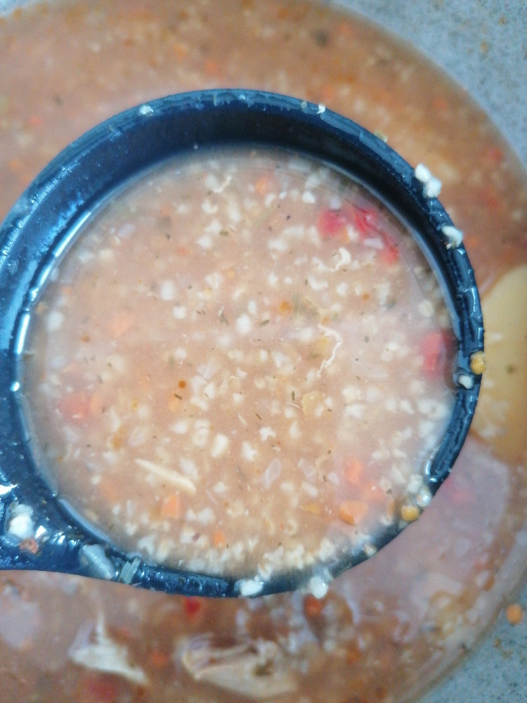 Хороший супец. Крупа, кусочки овощей. Только я ещё добавляю картофель, любим погуще.