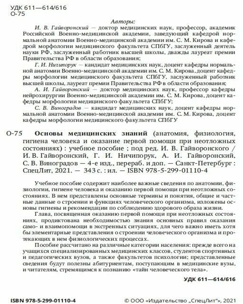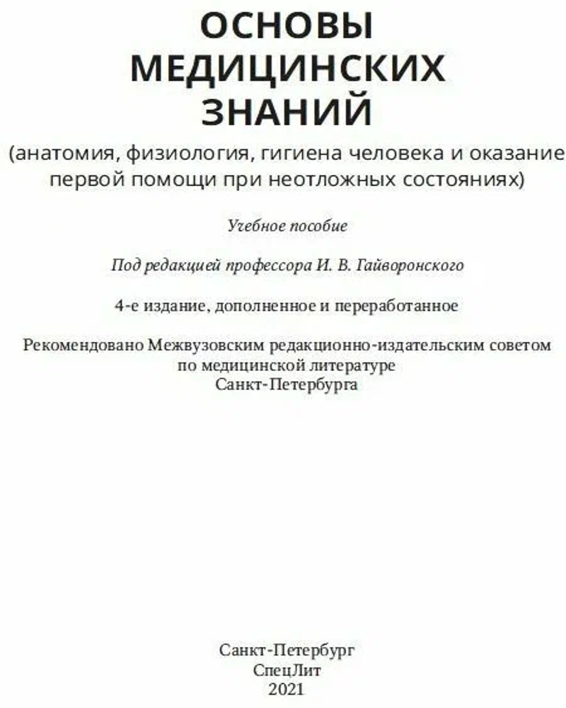 Основы медицинских знаний. Анатомия, физиология, гигиена человека и оказание первой помощиВ данный момент этот товар отсутствует в продаже. Возможно, у нас найдется аналогичный или похожий товар здесь. Учебное пособие содержит наиболее важные сведения по анатомии, физиологии, гигиене человека и оказанию первой помощи при неотложных состояниях. В нем представлены основные термины и понятия, общие и частные данные о строении и функциях человеческого организма, изложены основы гигиены и рекомендации по соблюдению здорового образа жизни. |