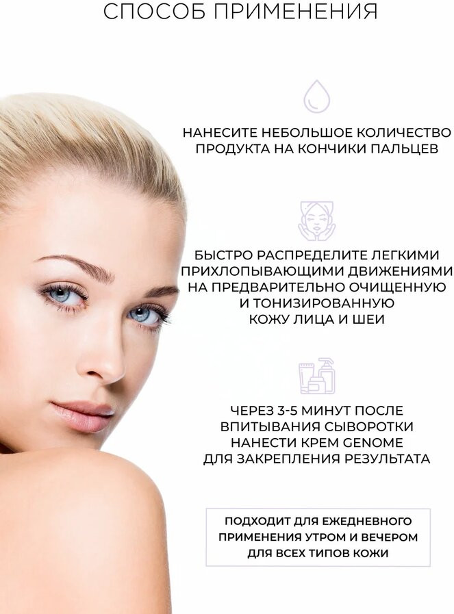 Способ применения: нанести несколько капель на предварительно очищенную кожу лица, шеи и декольте. Распределить сыворотку на коже тонким слоем мягкими похлопывающими движениями до полного впитывания. Для улучшения эффекта после применения сыворотки рекомендуется наносить крема линии ADEMY™. Избегать попадания в глаза.