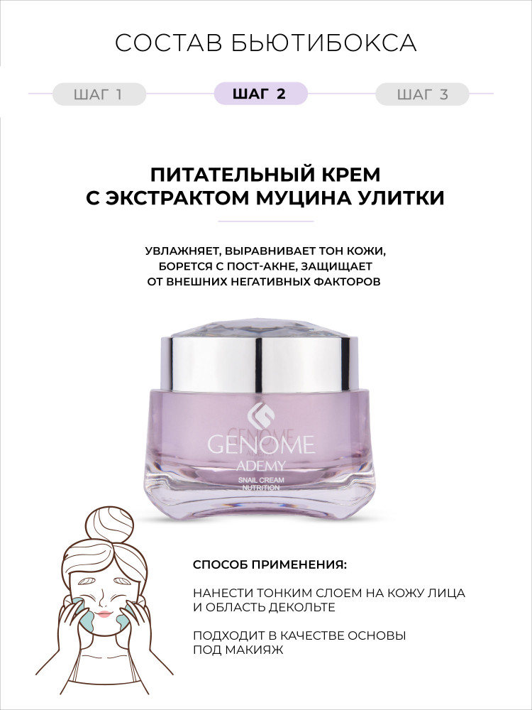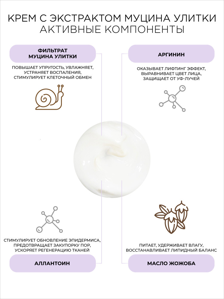 Питательный крем с экстрактом улитки: aqua, glycerin, caprylic/capric triglyceride, ethylhexyl palmitate, simmondsia chinensis (jojoba) seed oil, cetearyl alcohol, cetearyl glucoside, sorbitan olivate, cetearyl olivate, acetyl hexapeptide-8, ceramide 3, hydroxyethyl acrylate/sodium acryloyldimethyl taurate copolymer , snail secretion filtrate, allantoin, trehalose, beta-glucan, carbomer, arginine, sodium hyaluronate, tocopheryl acetate, sodium pca, xanthan gum, diazolidinyl urea, phenoxyethanol, disodium edta, parfum.