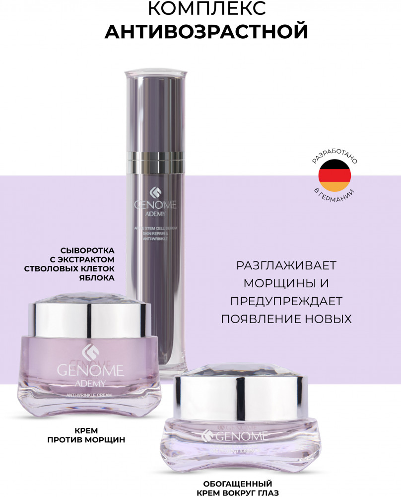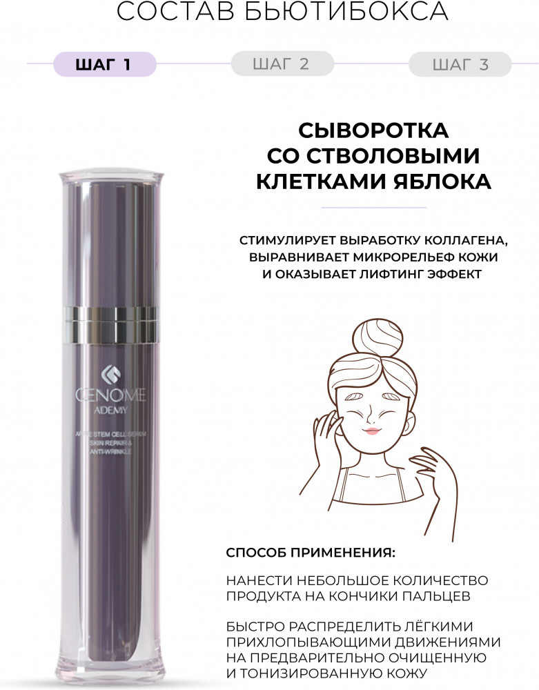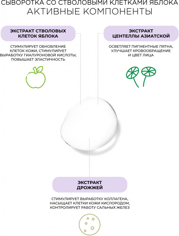Сыворотка с экстрактом стволовых клеток яблока: aqua, butylene glycol, glycerin, oligopeptide-1, hydrolyzed collagen, beta-glucan, yeast extract, centella asiatica extract, malus domestica fruit cell culture extract, aloe barbadensis extract, acetyl hexapeptide-8, sodium hyaluronate, sodium polyglutamate, panthenol, ethylhexylglycerin, phenoxyethanol, chlorphenesin.