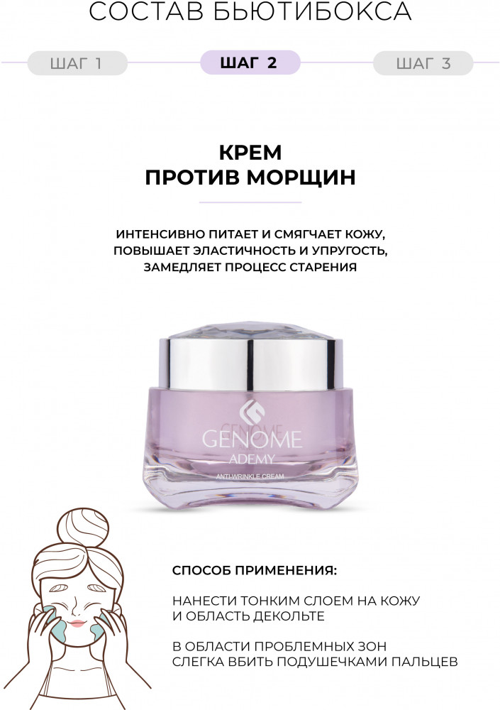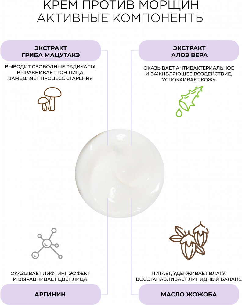 Крем против морщин: aqua, glycerin, caprylic/capric triglyceride, dimethicone, butylene glycol, simmondsia chinensis (jojoba) seed oil, sodium polyglutamate, palmitoyl pentapeptide-4, ethylhexylglycerin, beta-glucan, trehalose, cetearyl alcohol, oligopeptide-1, glyceryl stearate, hydrogenated lecithin, cetearyl glucoside, peg-100 stearate, aloe barbadensis extract, tricholoma matsutake extract, dimethicone/vinyl dimethicone crosspolymer, panthenol, sodium hyaluronate, hydroxyethyl acrylate/sodium acryloyldimethyl taurate copolymer , carbomer, arginine, diazolidinyl urea, phenoxyethanol, parfum.