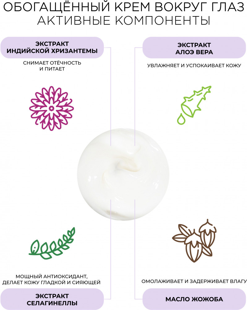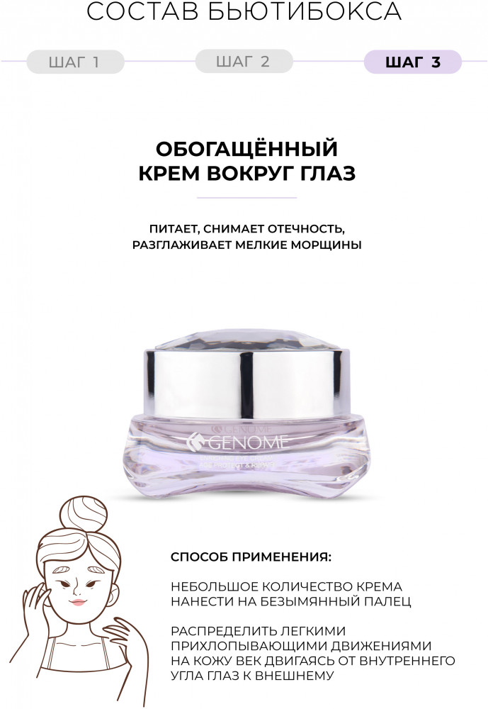 Обогащенный крем вокруг глаз: aqua, glycerin, caprylic/capric triglyceride, dimethicone, butylene glycol, simmondsia chinensis (jojoba) seed oil, sodium polyglutamate, palmitoyl pentapeptide-4, beta-glucan, trehalose, cetearyl alcohol, oligopeptide-1, glyceryl stearate, hydrogenated lecithin, cetearyl glucoside, peg-100 stearate, aloe barbadensis extract, selaginella tamariscina extract, dimethicone/vinyl dimethicone crosspolymer, ceramide 3, chrysanthellum indicum extract, panthenol, sodium hyaluronate, hydroxyethyl acrylate/sodium acryloyldimethyl taurate copolymer, carbomer, arginine, chlorphenesin, phenoxyethanol, aroma.